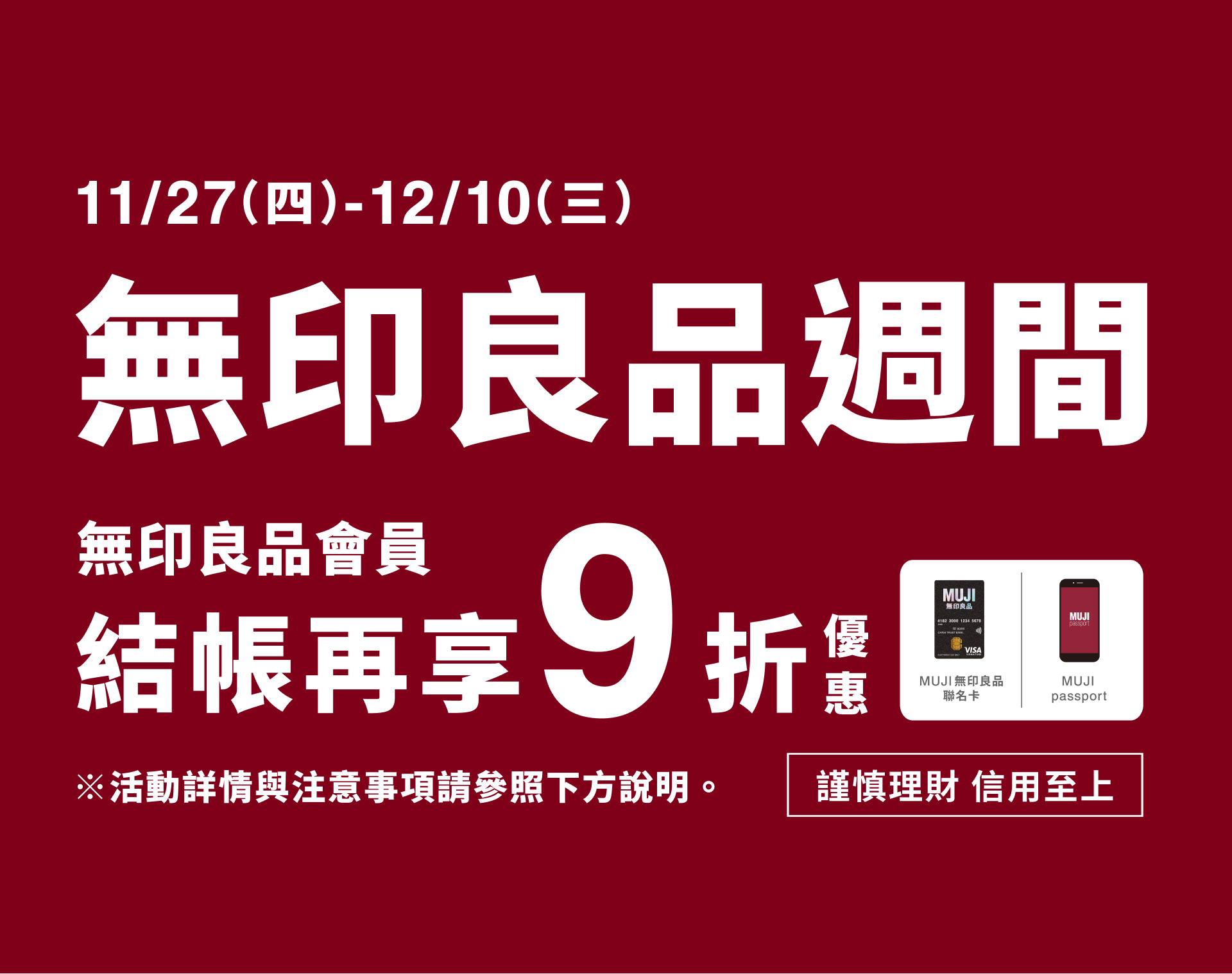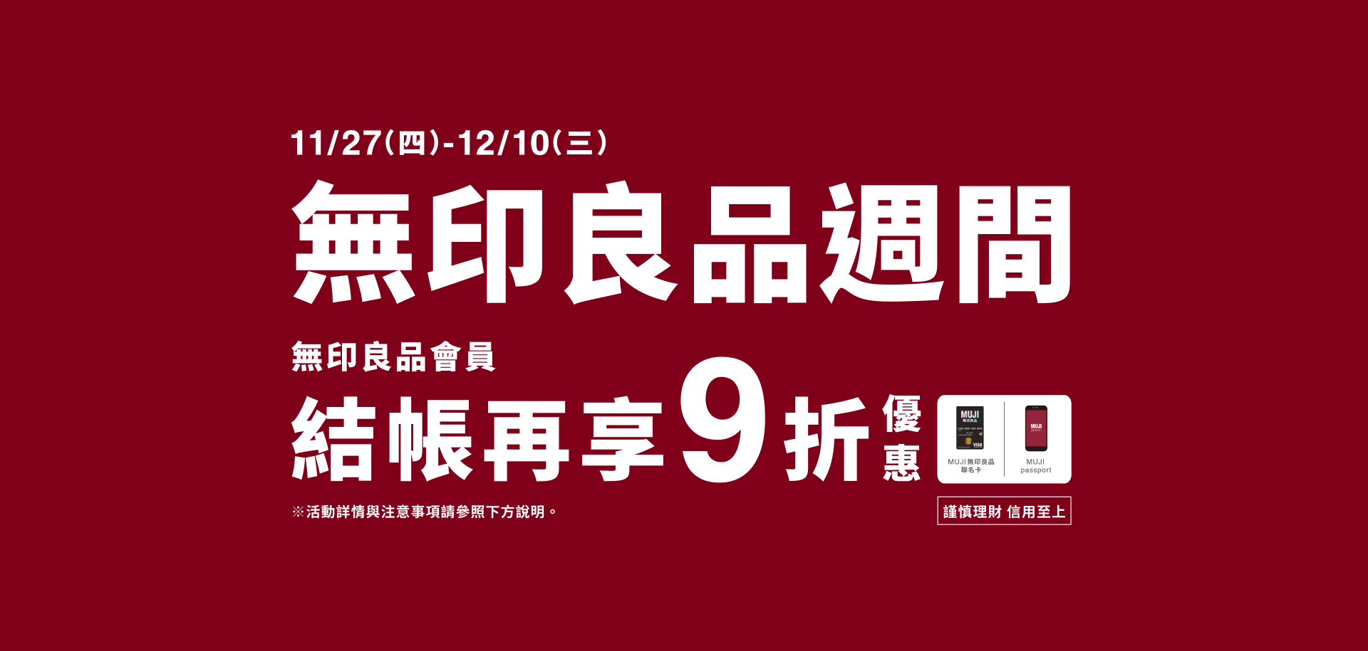 1. 無印良品週間活動僅配合於台灣無印良品實體門市(包含零售與餐飲)及官網購物消費時折抵。