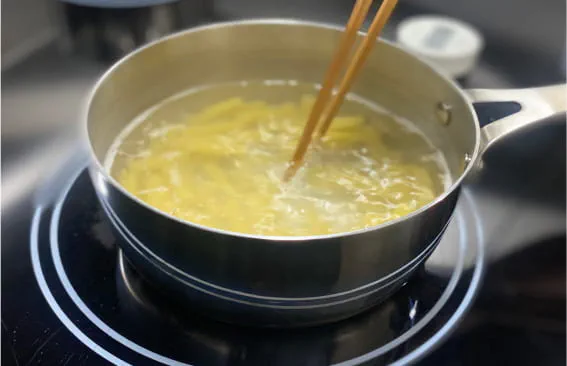 1.將義大利麵放入大鍋中加入足量的水煮沸後加鹽。(麵100g:水1L:鹽1小匙)