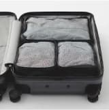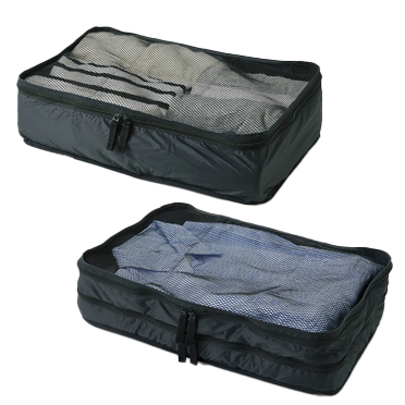一邊往返衣櫃與行李之間,一邊想像正在旅遊的自己。平常的實穿T恤,還有晚餐時要穿的襯衫或連身裙。如此認真挑選的衣服如果用塑膠袋裝就太無趣了。「再生尼龍可折收納袋」可以整齊地將佔空間的衣物整理好,也因為上方是網眼的設計,一眼就能看出裡面裝的是什麼。便於攜帶的小體積,在用不到的時候也不佔空間。在出差跟小旅行時都能派上用場,只要用過一次就不會再放手了。