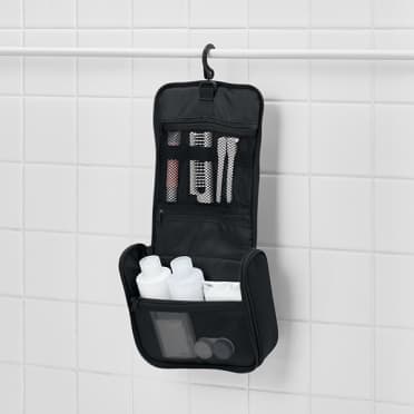 在飯店辦理完住房手續。進到房間後將硬殼拉桿箱放下,喘口氣後準備打開行李。在洗手間將「聚酯纖維吊掛盒型收納包」的拉鍊拉開,用內附的掛鉤把包包掛上就完成了。內容物一目瞭然,化妝水跟隱形眼鏡盒等必要物品也能直接取出,立刻開始使用。而且這是200mL的化妝水也放得下的大容量。而最輕鬆的就是退房當天了。將洗手台附近的物品放入,將拉鍊拉起後就打包完成。也不用擔心會有東西被遺漏。
