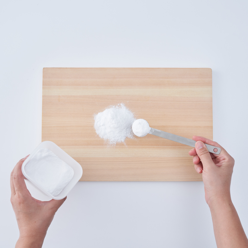 將小蘇打粉倒在欲消除異味之物品(如砧板等),靜置後再以清水洗淨。