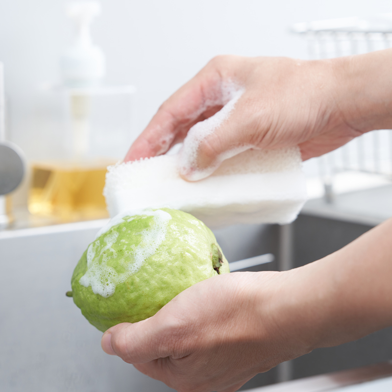 取適量本產品加水稍微搓洗蔬果後,浸泡1-2分鐘後洗淨即可。