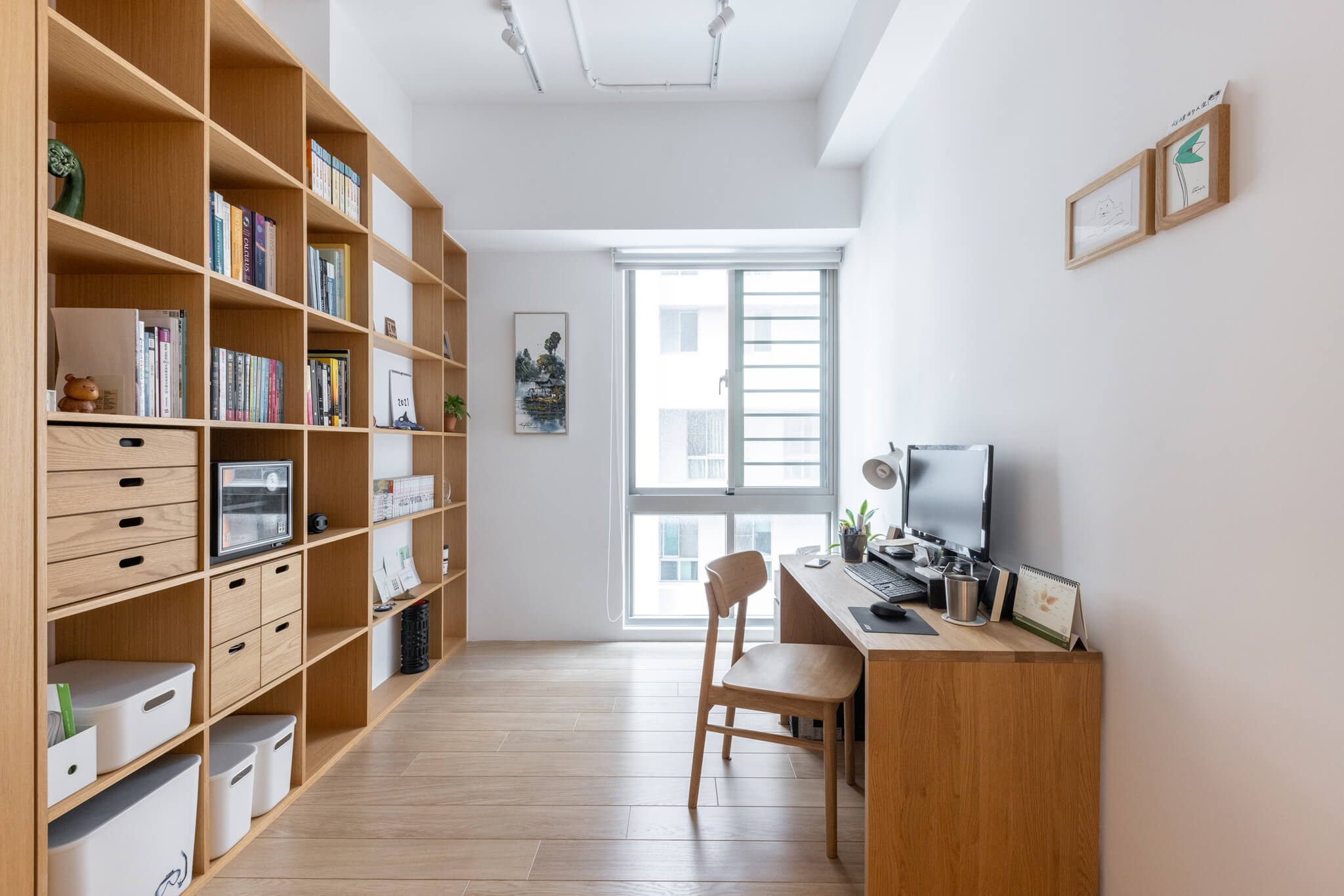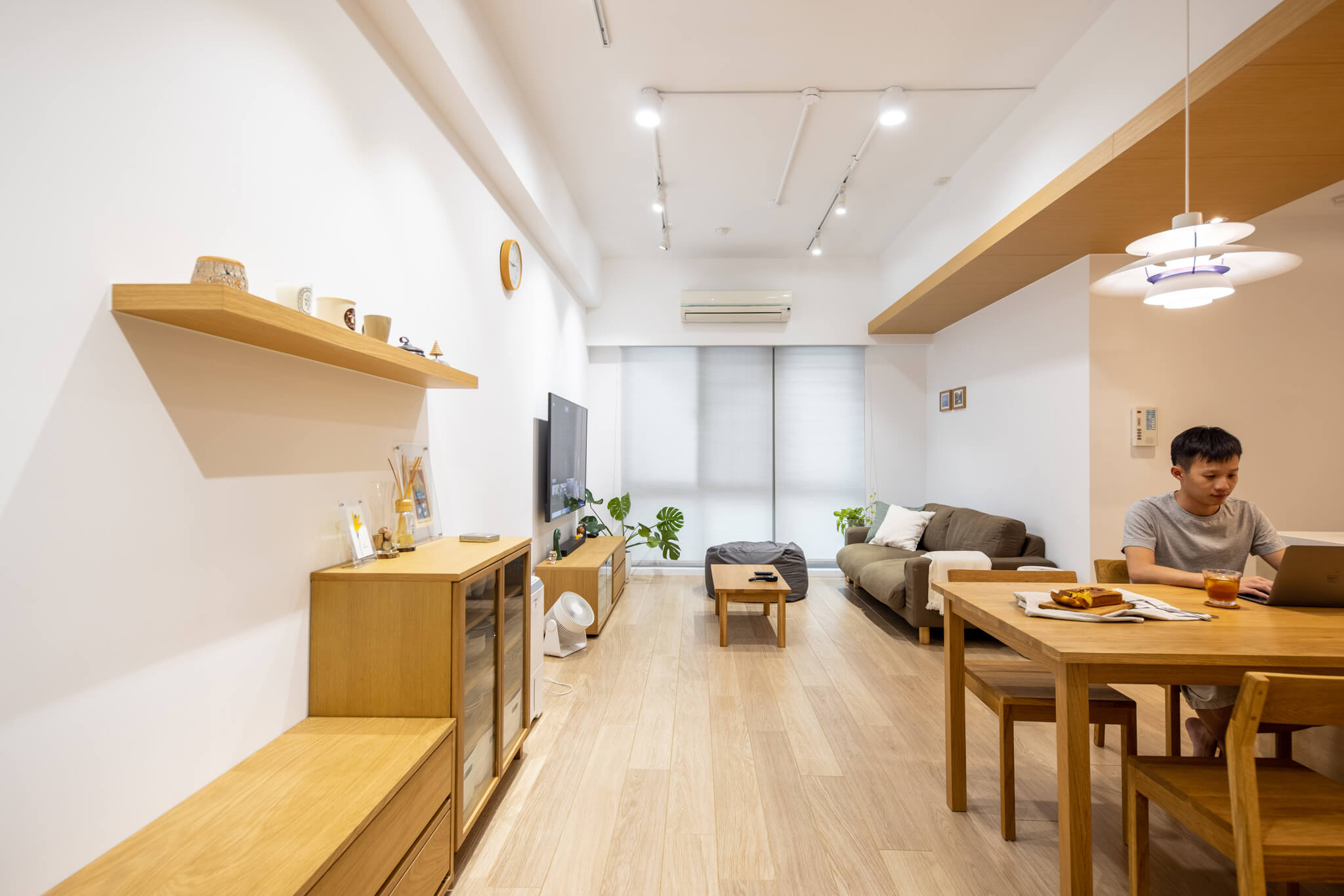 委託人愛上無印良品木製家具的自然風味,欣賞每塊木材獨有的紋理樣貌,白色牆面配上橡木色系家具讓整體視覺溫潤舒適,搭配植栽及收藏品點綴,讓空間又多了些活潑感。