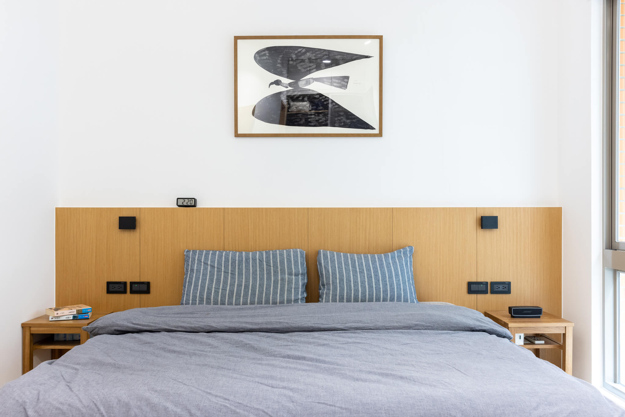 委託人在主臥床組兩旁放置無垢材桌邊凳/板座做為床頭櫃使用,此商品擁有視為矮桌使用時恰到好處的高度,更有著當成板凳使用時所需的堅硬度,座面下方夾層也有簡易收納空間,一品多用的特長創造出更多靈活運的可能。