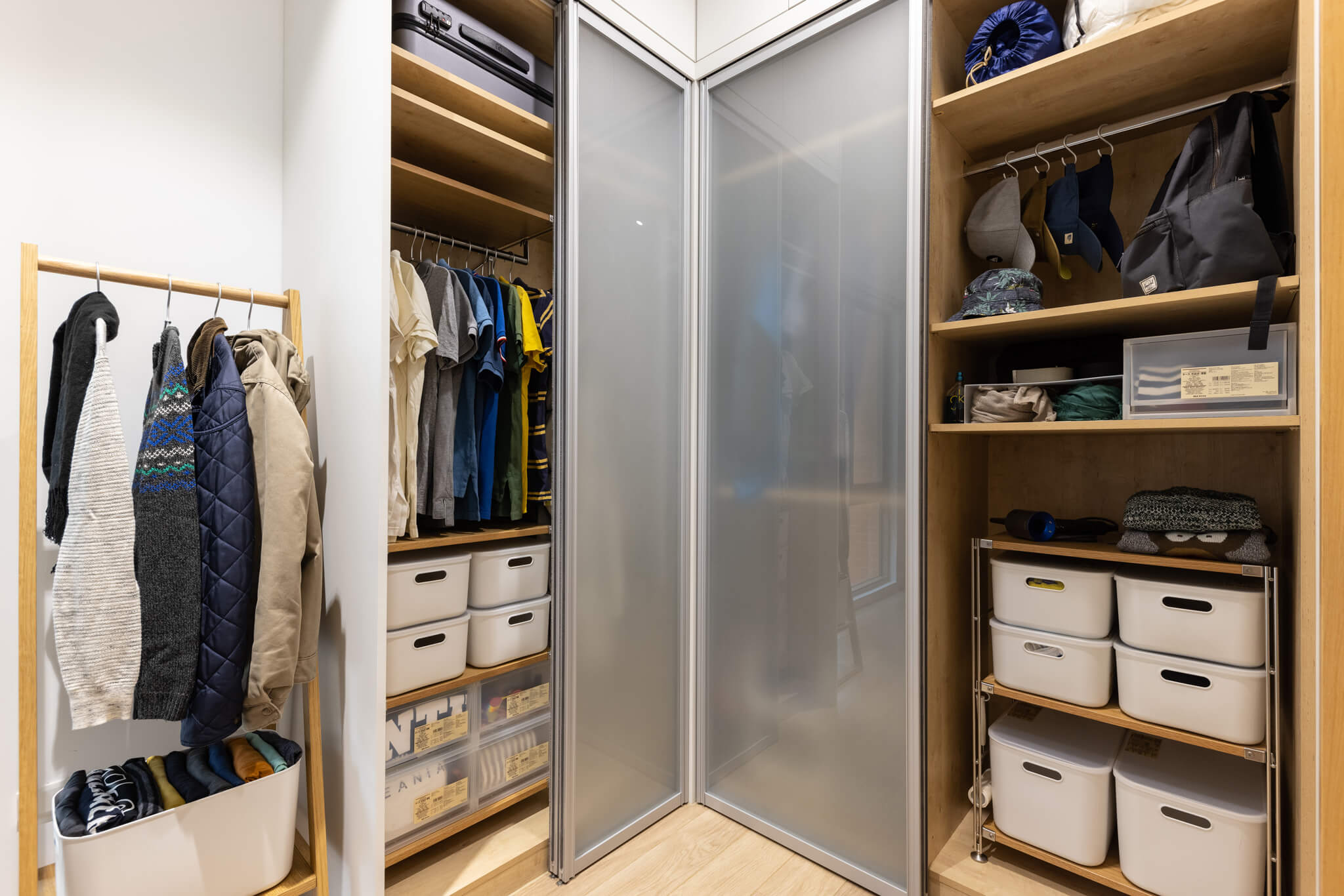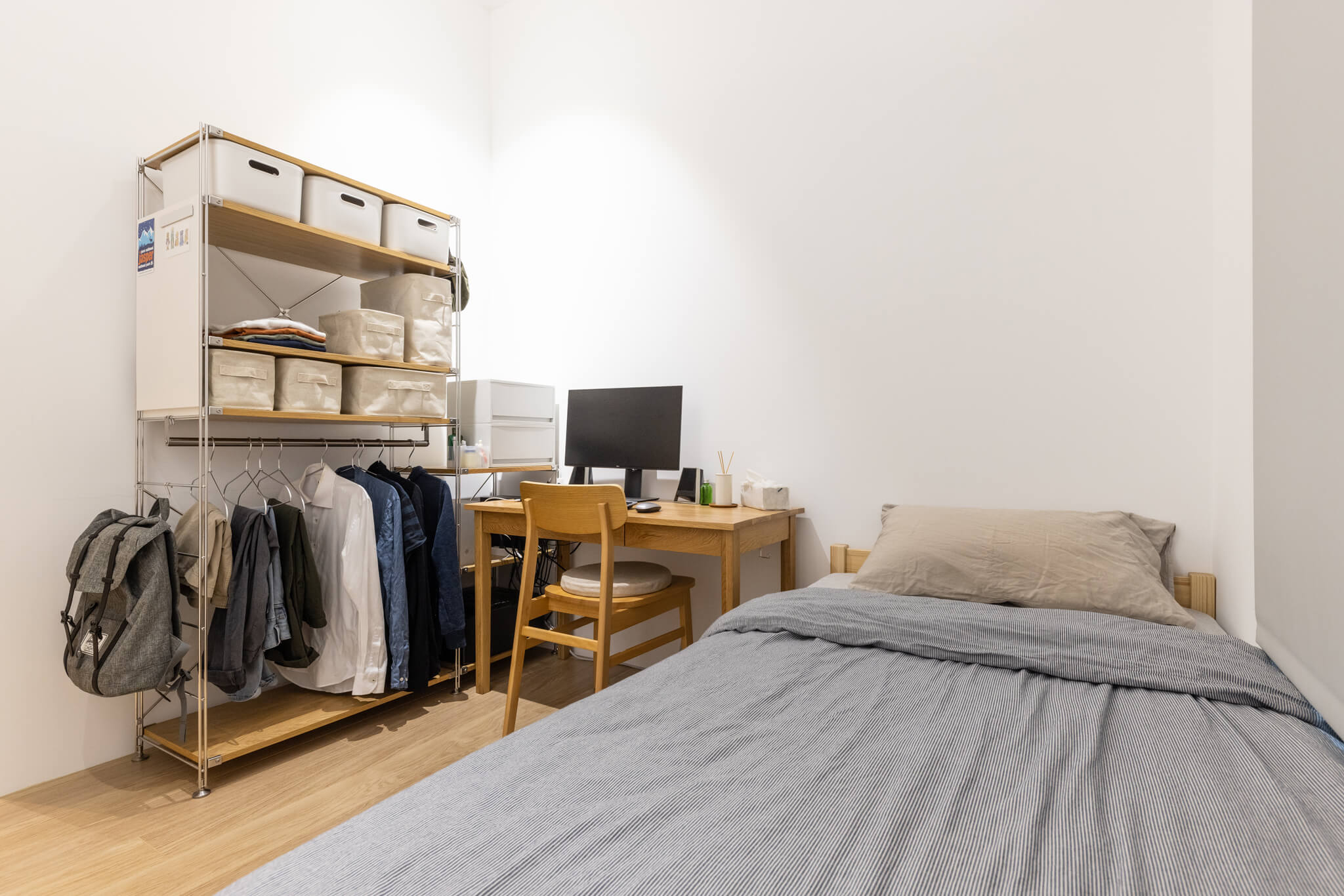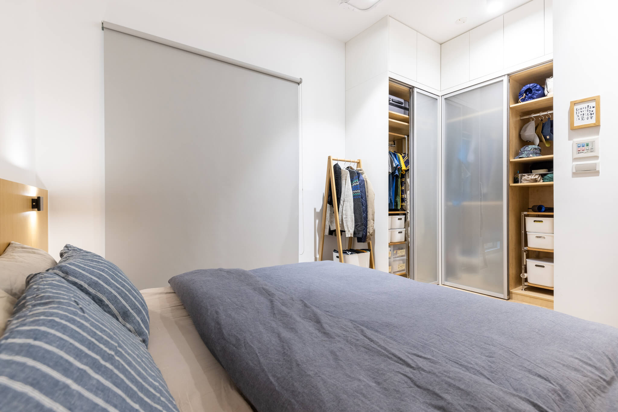 主臥室選用變化性高、可依使用者需求自行調整的SUS層架,做為衣櫃並搭配拉門增加隱蔽性。能因應無印良品基本寸法選擇收納用品,其多樣化素材依收納息慣的不同而變化調整,即便有再多的生活雜物,也因統一的收納用品而顯得格外整齊。一旁的橡木玄關衣帽架則可用來擺放使用頻率較高的外套及配件。