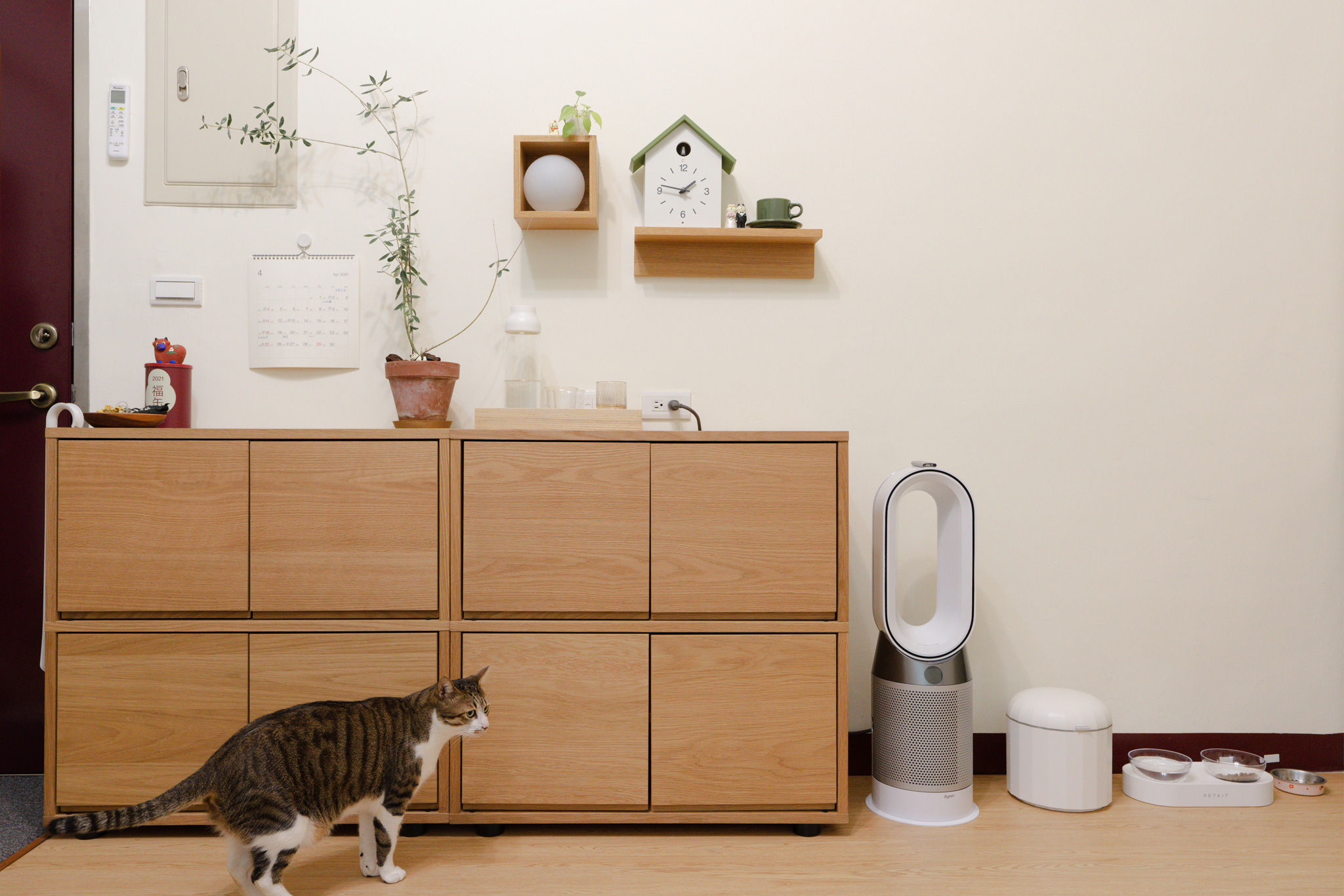 夫婦兩人喜歡乾淨明亮的色調,因此在空間中使用大量的白色、綠色與橡木色搭配,保有室內風格的一致性、減少雜亂感。玄關鞋櫃使用可追加木板門的組合櫃,主要希望未來搬移住處時,能轉換為儲物櫃的用途使用。牆面則利用壁掛家具,擺放咕咕鐘及喜愛的杯盤組點綴空間。