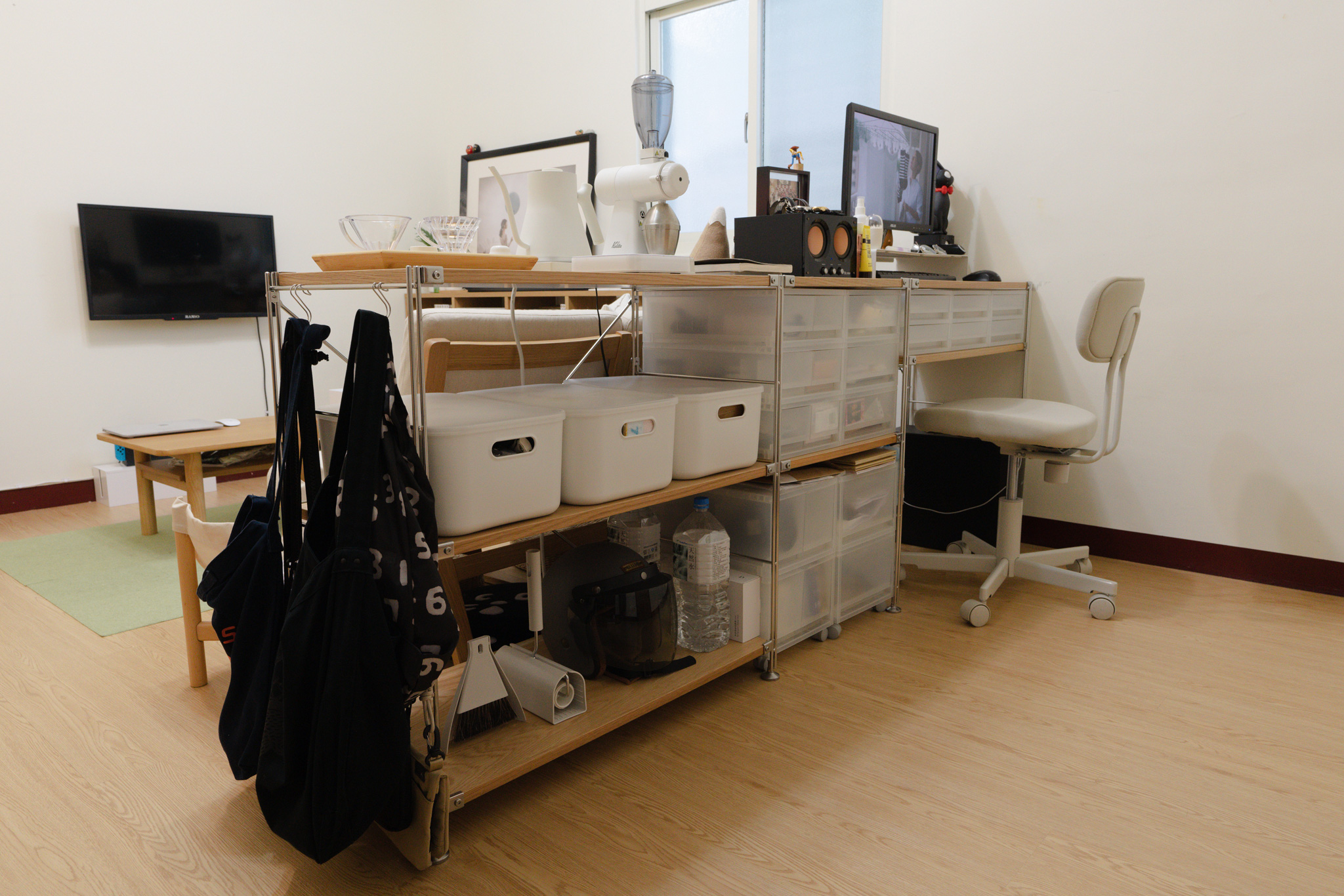 先生的興趣是手沖咖啡,目前也正努力朝向成為專業咖啡師的目標邁進。於家中練習沖製咖啡時,83cm高度的SUS層架組,剛好適合作為工作台;同時也為了空間的多用途使用,SUS層架組一邊陳設咖啡器具,另一邊則設定為書桌使用,收納功能則搭配PP盒與軟質收納盒對應,減少檯面上的雜物,讓空間保持清爽。SUS層架組側邊利用掛勾吊掛外出常用的包包,方便拿取使用與歸位。
