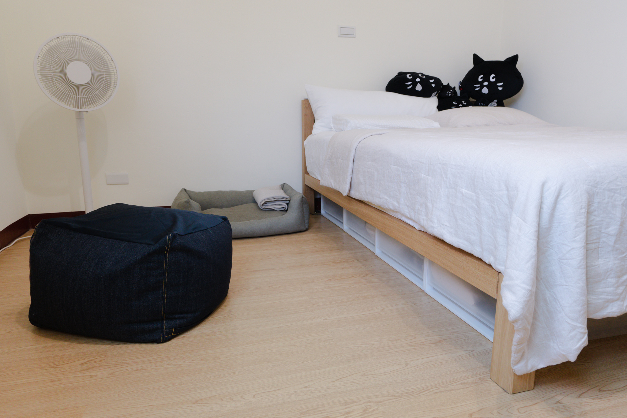 兩人想法一致,希望盡可能減少臥室內雜物堆積,保持空間乾淨清爽,因此規劃利用床下空間擴充收納功能,減少視覺干擾以避免影響睡眠,讓身心可以好好放鬆休息。