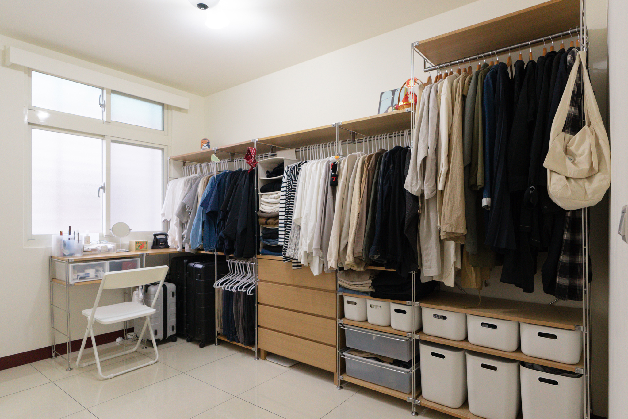 更衣室亦選用SUS層架組來打造,於牆面一字排開,內部收納的衣物也按照顏色排序,方便收納、辨識外,也能在出門前按照心情進行衣服的挑選。小件的衣物及配件,則利用斗櫃及收納用品分類收納。
