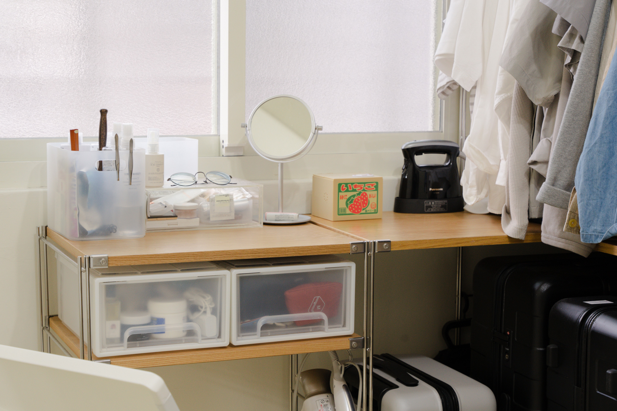 靠近窗邊、採光最好的位置,利用SUS橡木轉角追加棚,替太太設置梳妝台及方便整理衣物的檯面。