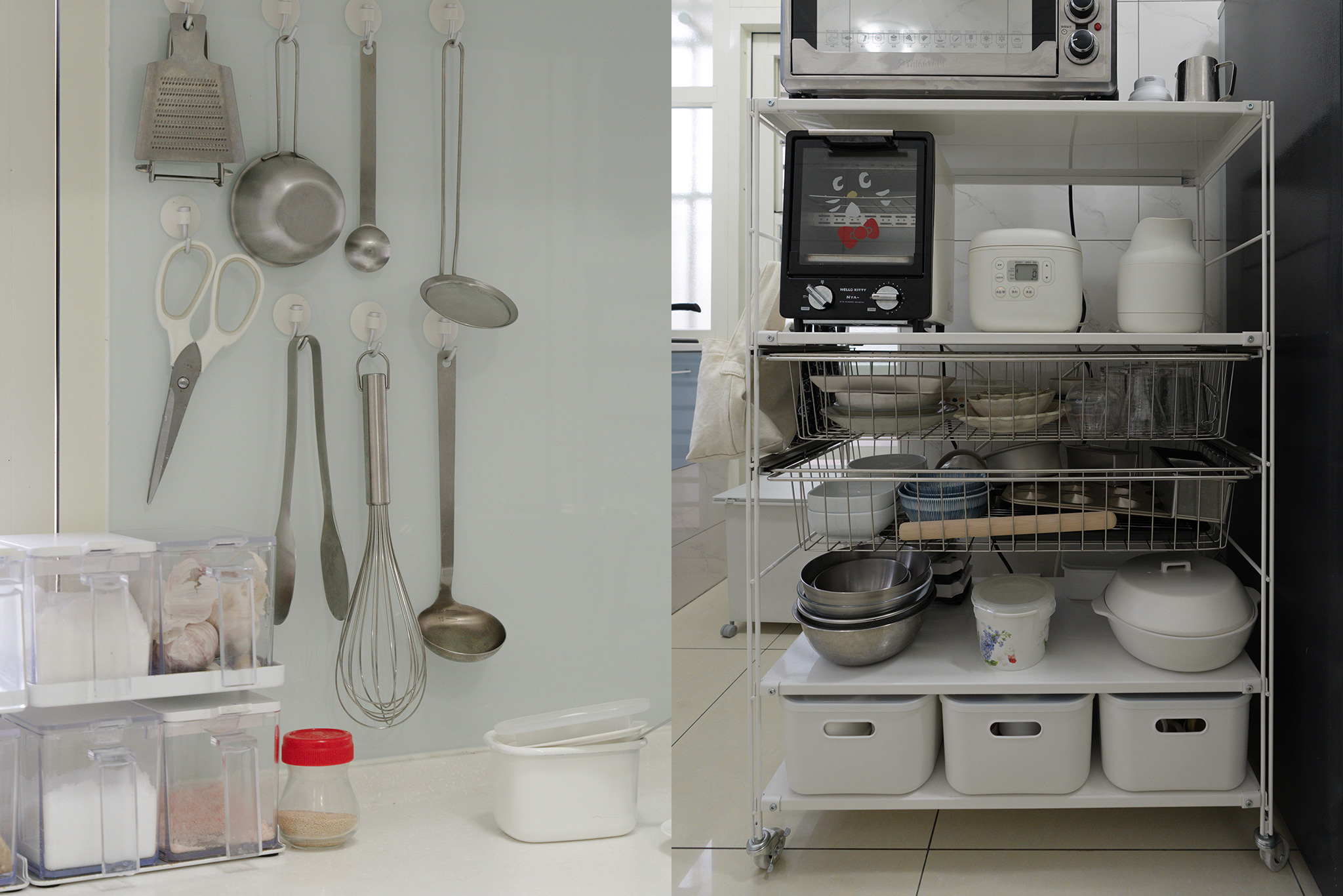 平常有下廚習慣的太太對於廚房也下足了不少工夫,利用掛鉤將常用的調理器具勾置於牆面;考量到視覺與清潔問題,以色調單一的SUS鋼製層架組作為電器及廚房用具的收納架,烤漆材質在清理上也相當方便。使用者的需求差異,跳脫傳統家具的單一功能性,無印良品可變性高的收納家具更是貼近每位使用者的生活習慣。