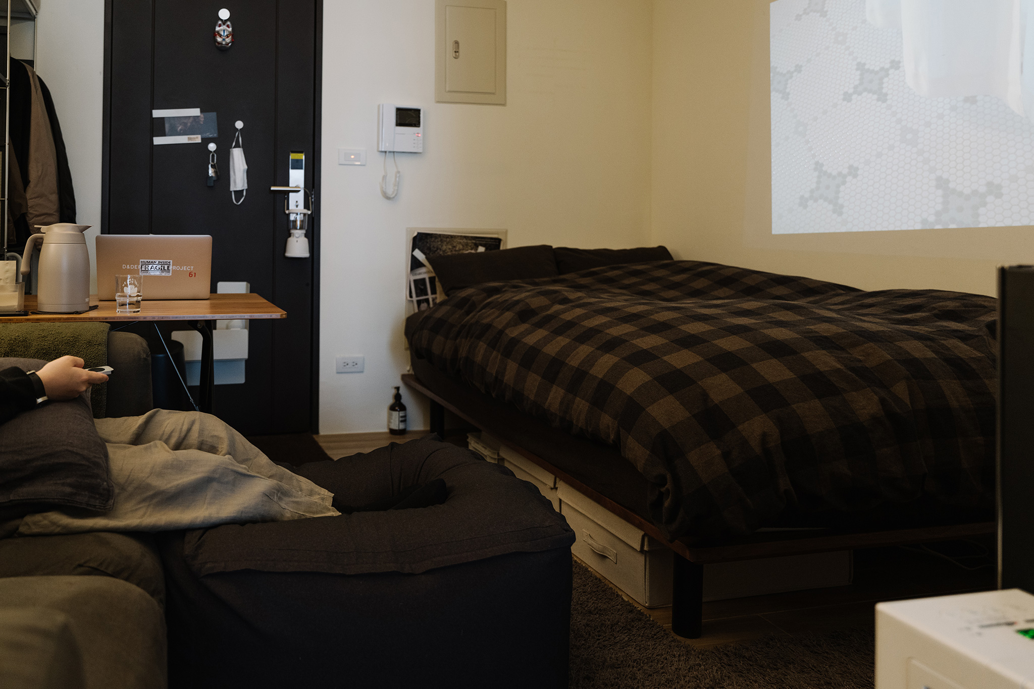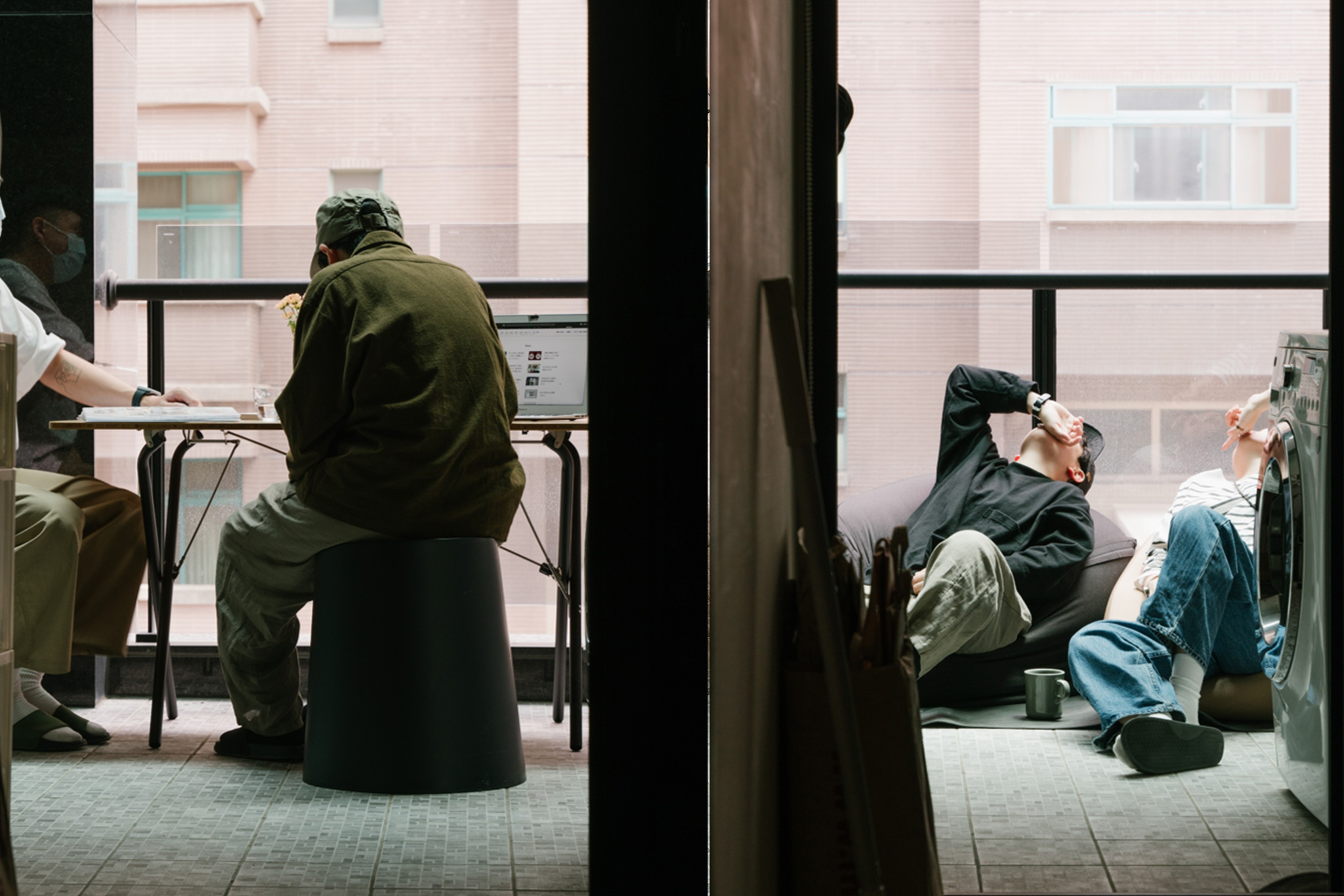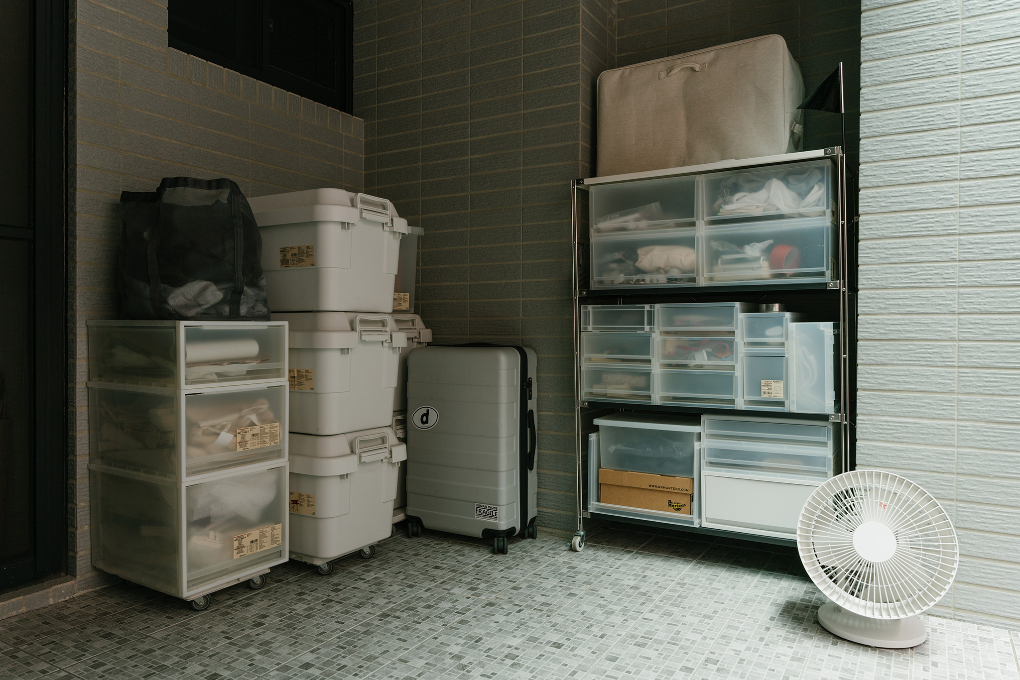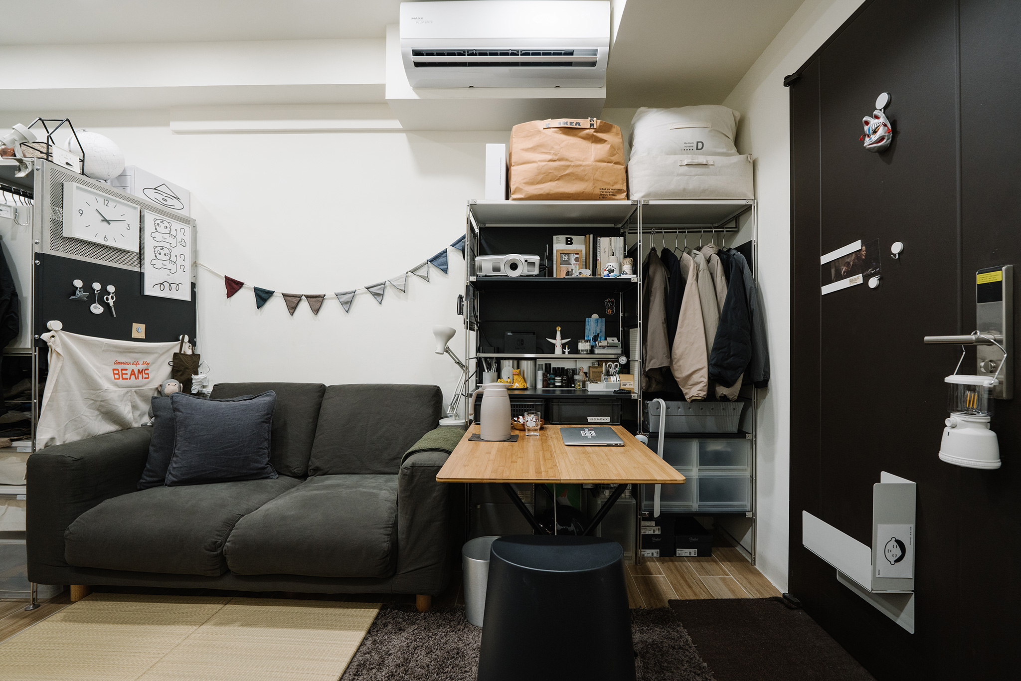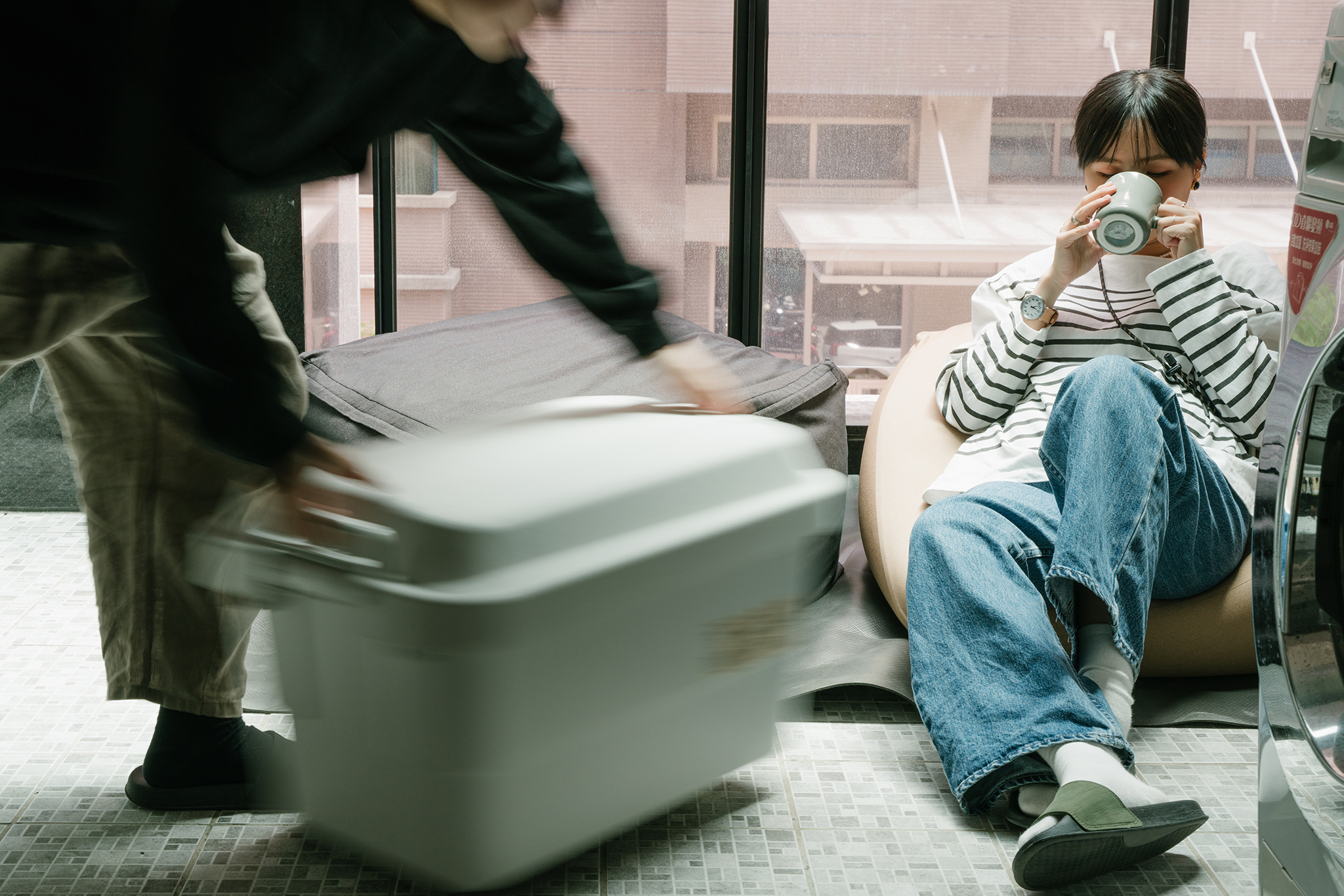 這個租屋處與過往承租的物件最大差別在於陽台空間偏大,除了作為雜物收納使用外,也作為平時接案工作、朋友聚會的活用空間。同樣的生活場域,只要移動家具就可變化成不同的使用方式,與委託人喜歡一物多用的理念不謀而合。平時用於收納的耐壓收納箱,不僅能作為矮桌使用,耐重100KG的特點也可作為椅凳使用。