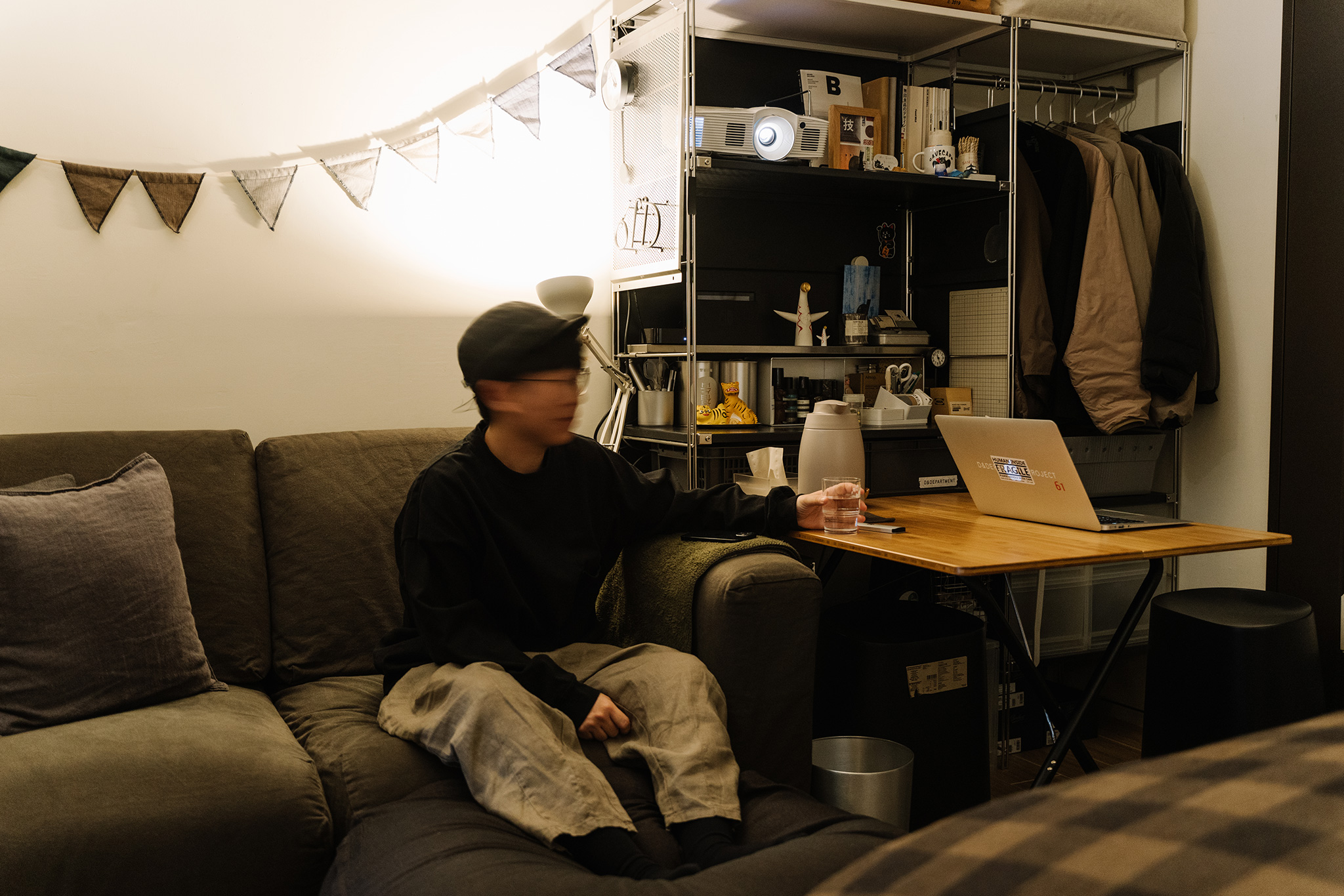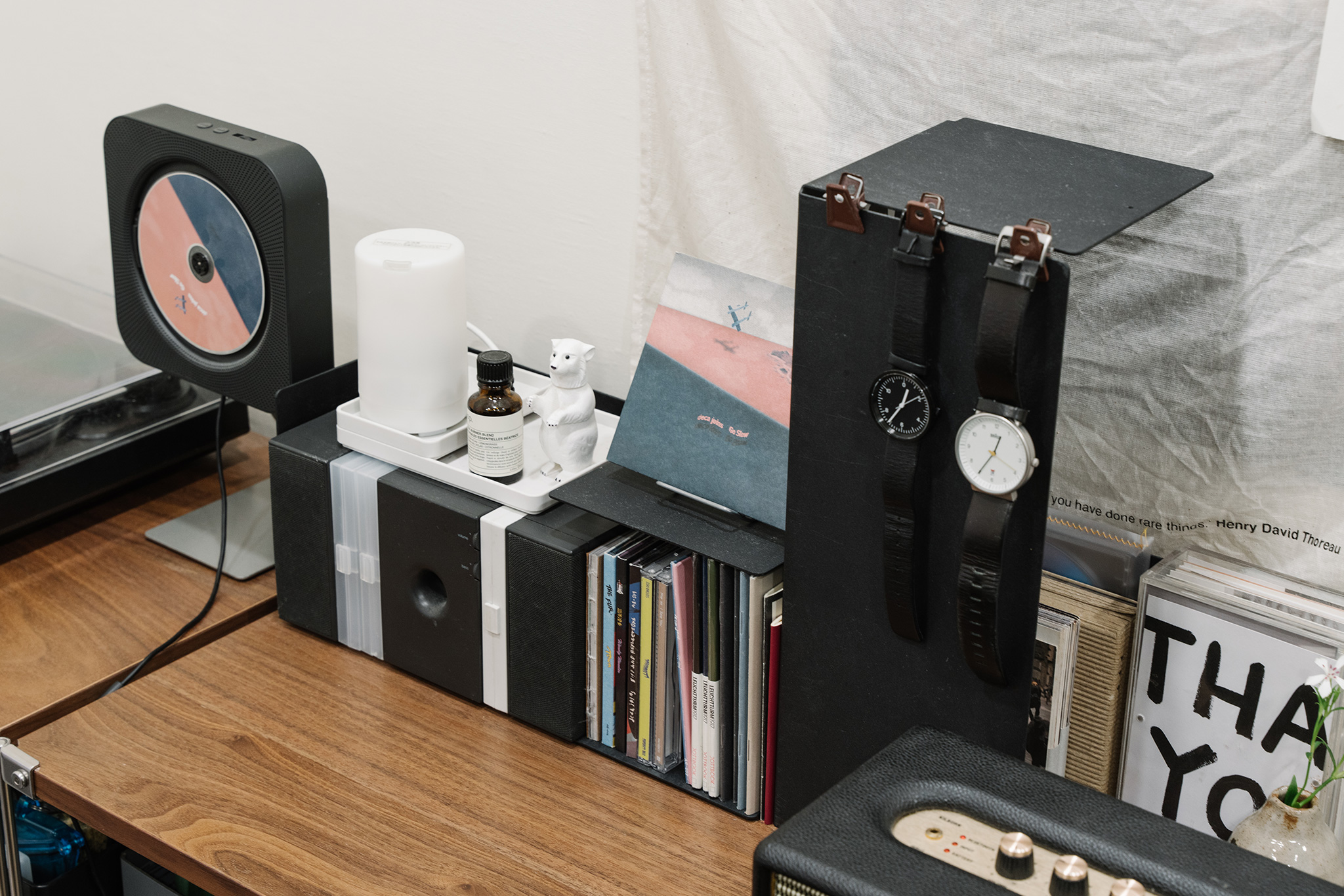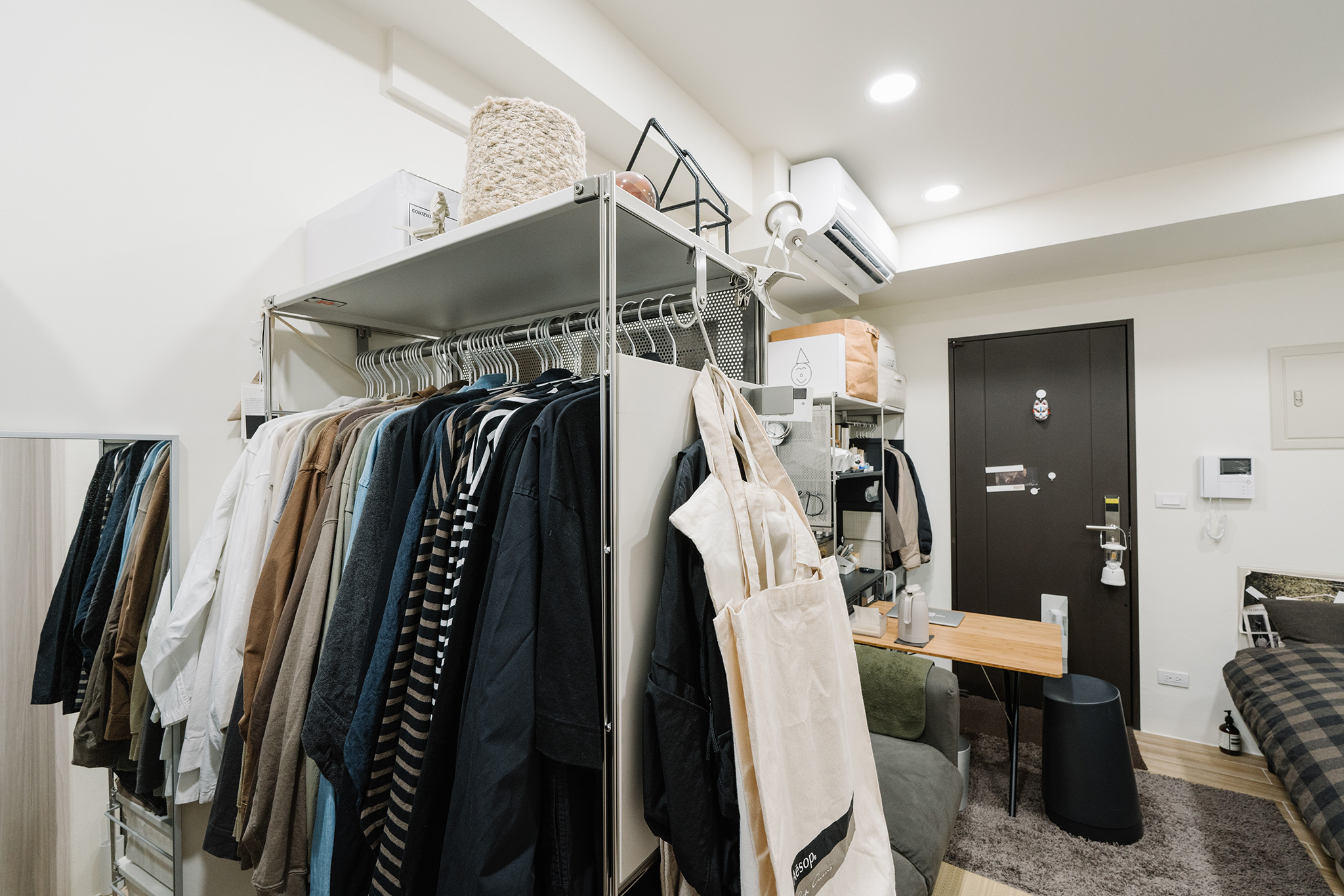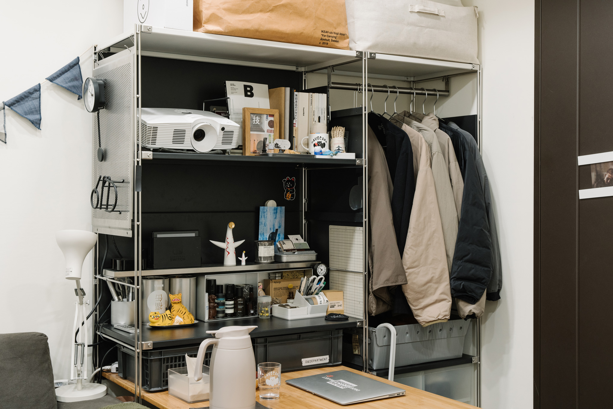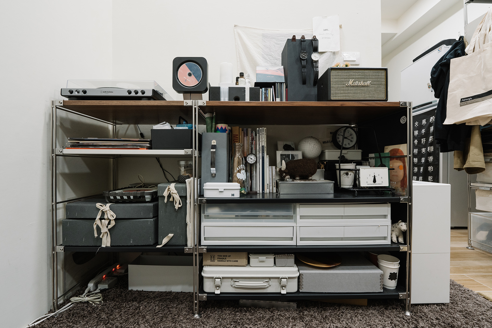 系統櫃及木作櫃會受限房內的格局及擺設,因此尋找租屋處時會以空屋作為優先考量。挑選收納家具時即鎖定活用性高、可依生活型態調整的SUS層架系列,不僅僅是作為收納物品的層架,同時也是為自己安排「家」的風景。