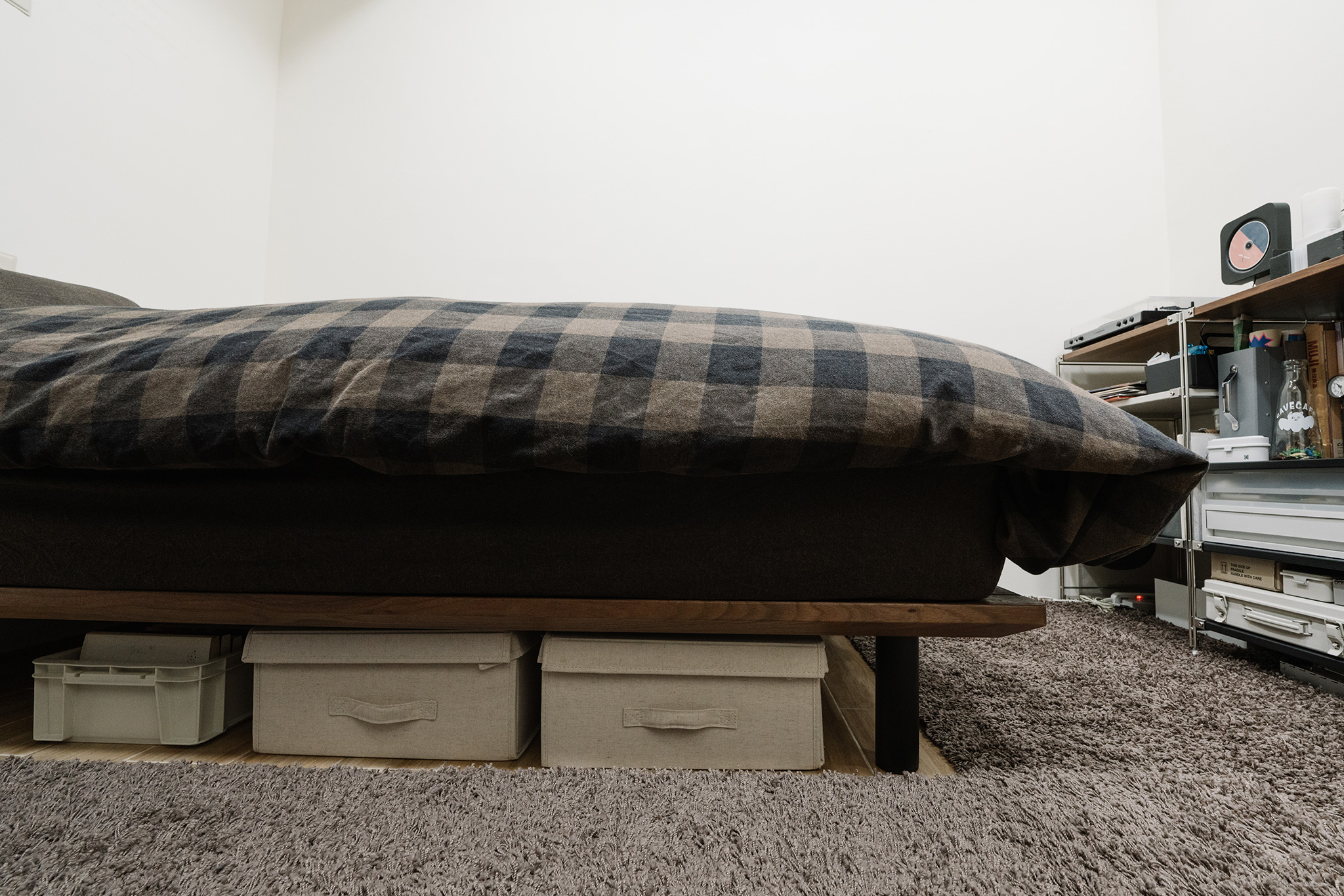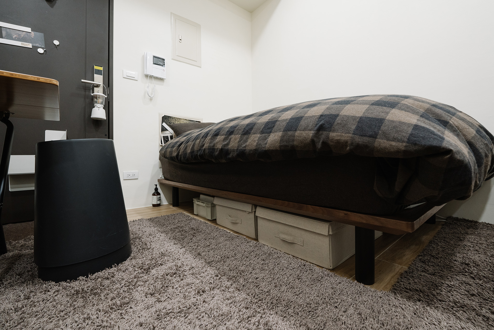 原先構想將床墊直接落地使用,後來考量到台灣居住環境普遍潮濕,因此選擇了可依需求挑選床腳高度、顏色的組合床台系列,除了延長床墊使用壽命外,也增添了床下空間的收納力。