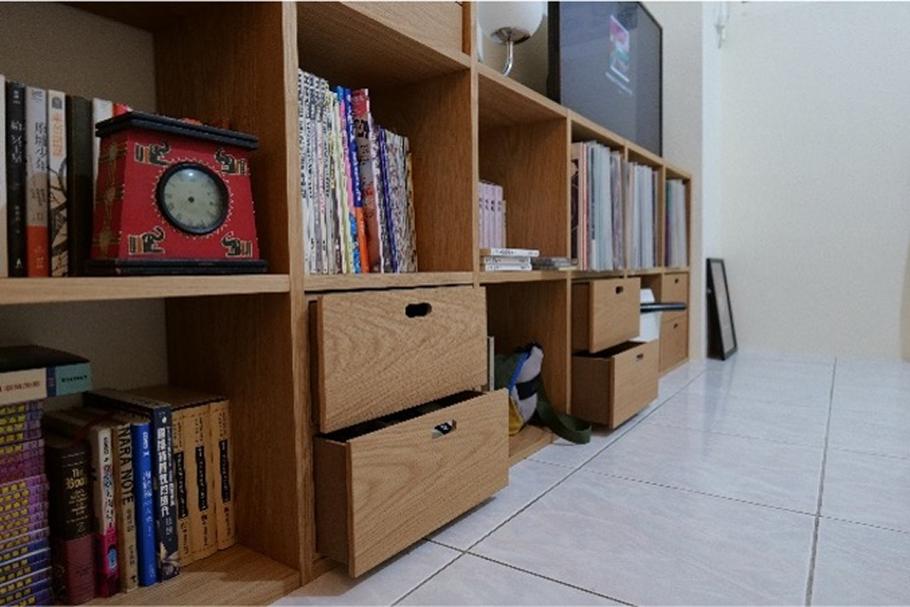 雖然普遍較常見到SUS家具,但對於我所要收納的主要物品來說(書籍、黑膠唱片…),自由組合層架的規格較適合;此外,每個格子放入搭配的收納用品時剛剛好的密合視覺感,呈現出一種[一套家具可以搞定所有收納大小事]的模組秩序,貼近自己的美學感受偏好。