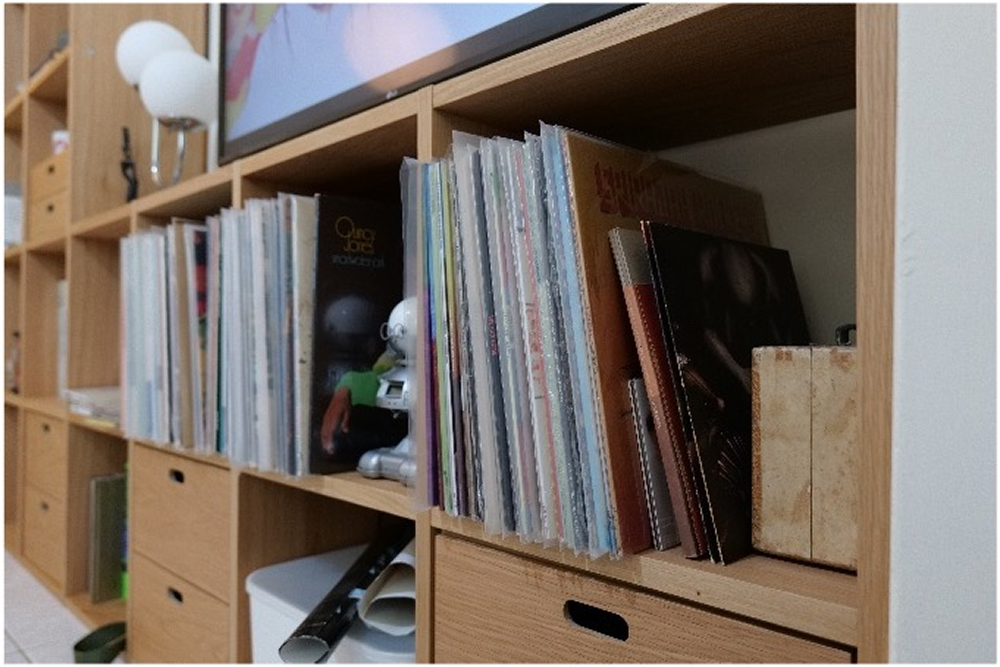 雖然黑膠唱片已經就定位,但目前唱盤機還留在台北,之後應會再用木架安置在自由組合層架旁邊的角落。
