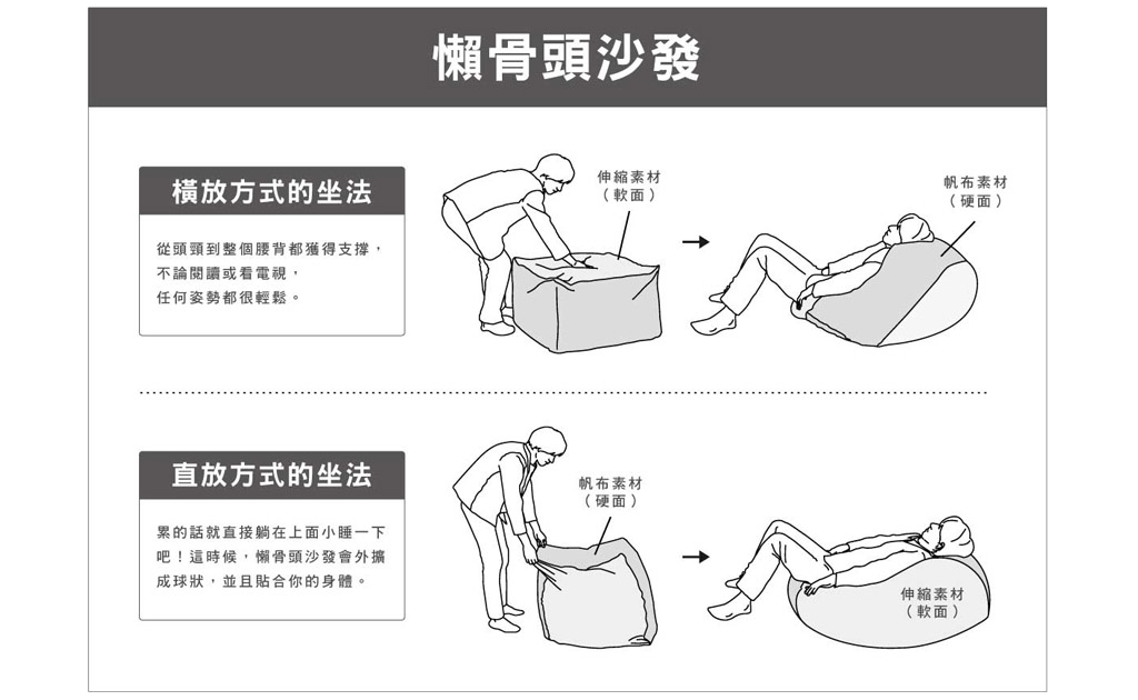 作為舒壓商品的首款推薦,MUJI無印良品的懶骨頭沙發內裡僅以0.5mm的超微粒發泡棉填充,不僅細緻不易塌陷,更適合各種身型坐臥。獨特的開發概念,橫放時,可感受到腰椎、背部及肩頸皆獲得完整支撐,最適合閱讀或看電視時的坐臥姿勢。而直立使用時,懶骨頭沙發會依據身形外擴為球狀,確實包覆背部與臀部,適用於午休等需要短暫睡眠時,感受舒壓、伸展與放鬆身體的好感體驗。