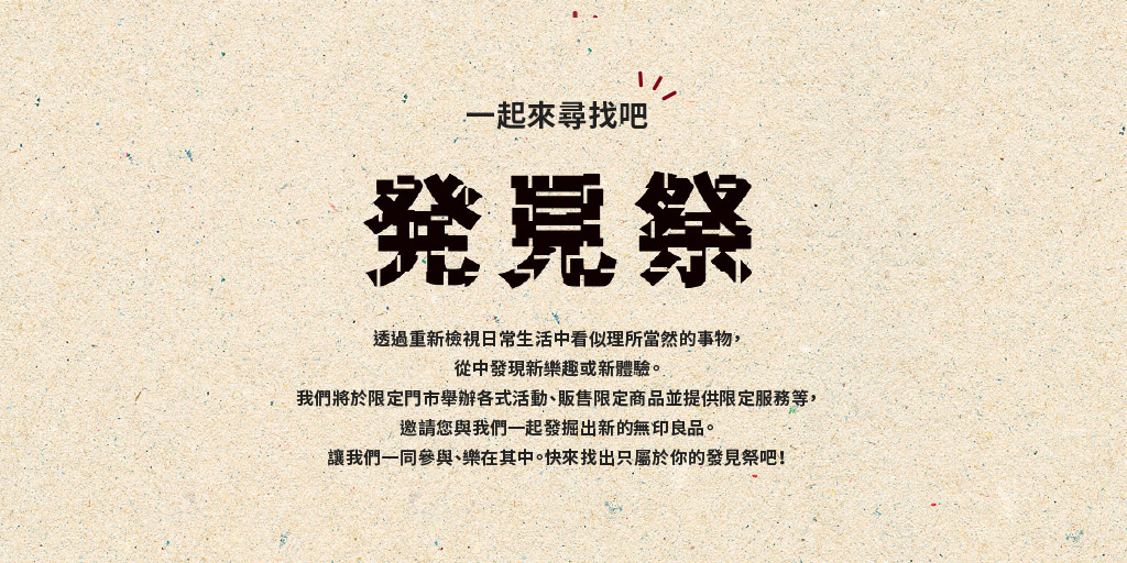MUJI無印良品首次舉辦的「發見祭」活動,出發點是希望透過重新檢視日常生活中看似理所當然的事物,並結合台灣在地文化,讓門市除了販售商品與提供專業服務外,更成為多樣化生活提案的場域,分享各種體驗活動,實踐好感生活的豐富面向。5/20-5/30,將於統一時代、微風、高島屋、A11、巨城、台中、台南、巨蛋共計8家門市,舉辦台灣首次「發見祭」活動,期間除販售限定商品與獨享優惠之外,更將企劃多場在地生活講座及手作體驗活動,希望與消費者一同發掘「良品」價值。