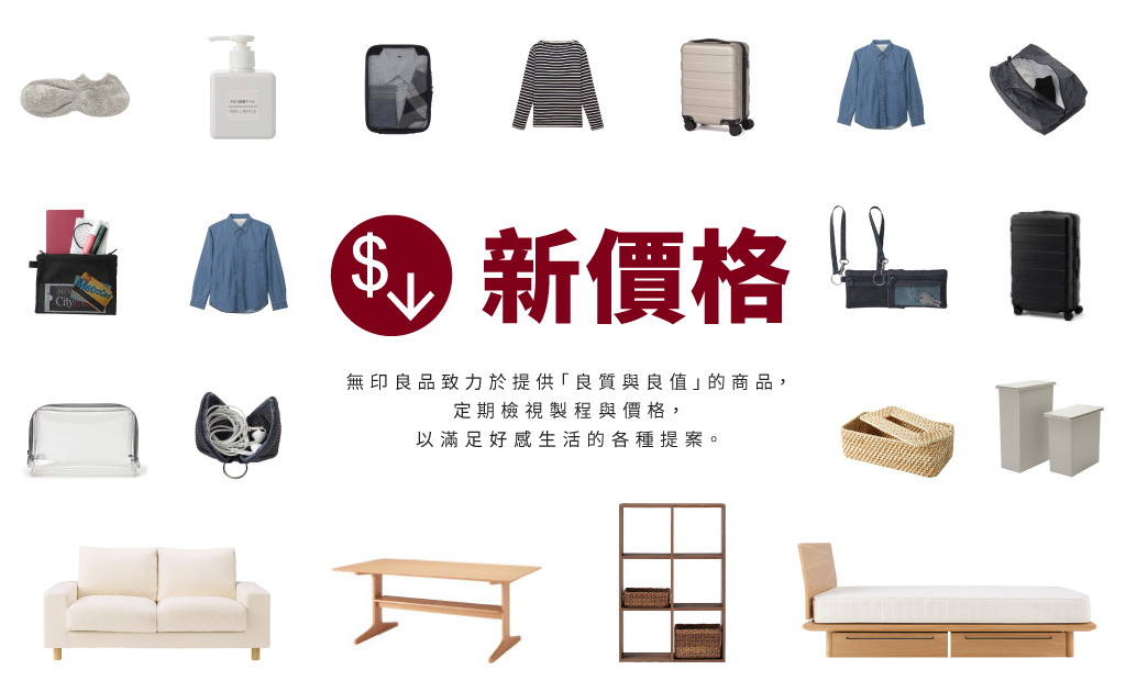 MUJI無印良品每年定期檢視商品生產製程,包含開發新素材使用、產量與產地及物流運送的檢討,讓成本及商品售價得以調整。繼3月份近500支品項調整新價格以來,這次是今年第2波調整新價格。本次新價格商品超過700支品項,平均調降幅度約為15%左右。