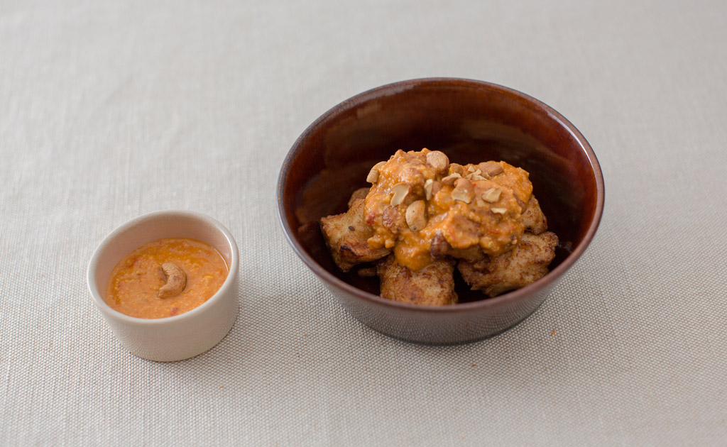 使用低脂的雞胸部位,以鹽麴醃製軟化肉質,油炸後淋上微辣的宮保咖哩醬及烤腰果。