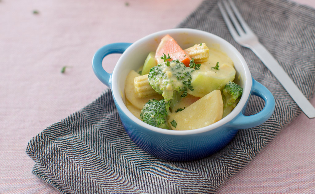 特製的奶油白醬中加入台灣東勢彩色胡蘿蔔、豆薯、水果玉米筍等六種時令蔬菜。