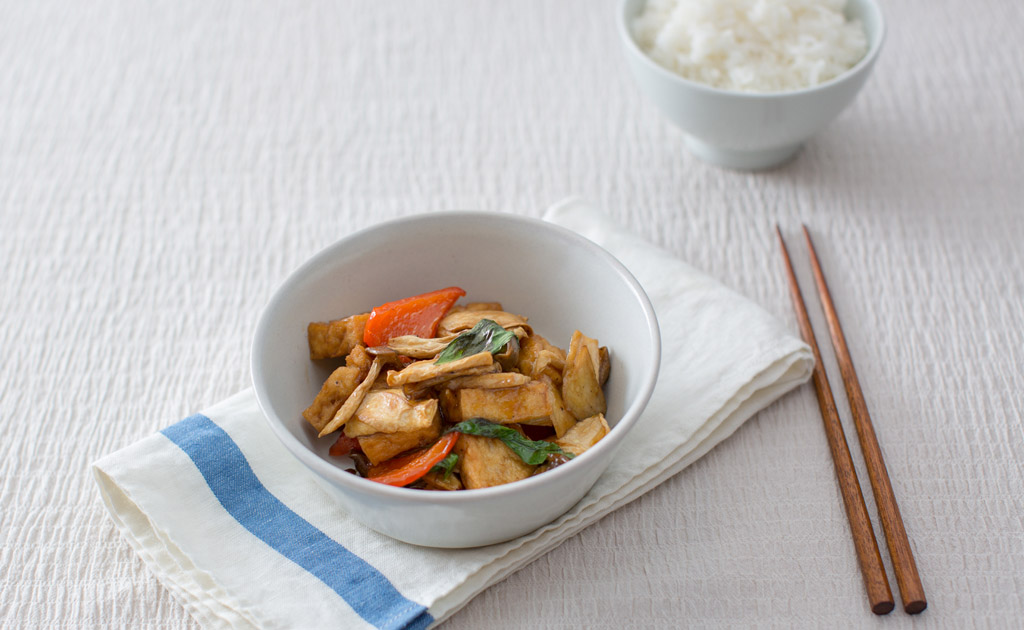 台式傳統三杯做法,將有機板豆腐油炸後,與烤杏鮑菇、茭白筍、甜椒等蔬菜拌炒,最後加入九層塔。