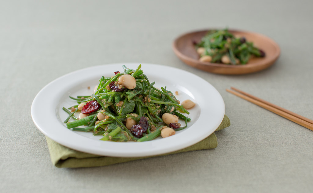 高纖的龍鬚菜和水蓮拌入以味噌與胡麻油為基底的醬汁,搭配蔓越莓果乾以及健康的台灣紅藜,健康清爽不油膩。