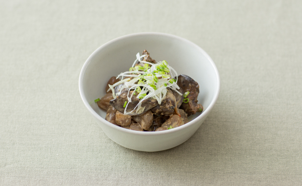使用國產無毒安心雞肝,於日式高湯中燉煮到軟嫩入味,再與微辣的蒟蒻混合,最後拌入芥末美乃滋醬。