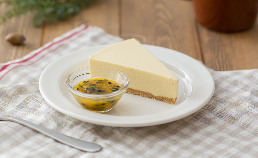 使用台灣產百香果,搭配奶油乳酪及優格所製作而成酸甜的生乳酪蛋糕,再淋上百香果果醬。