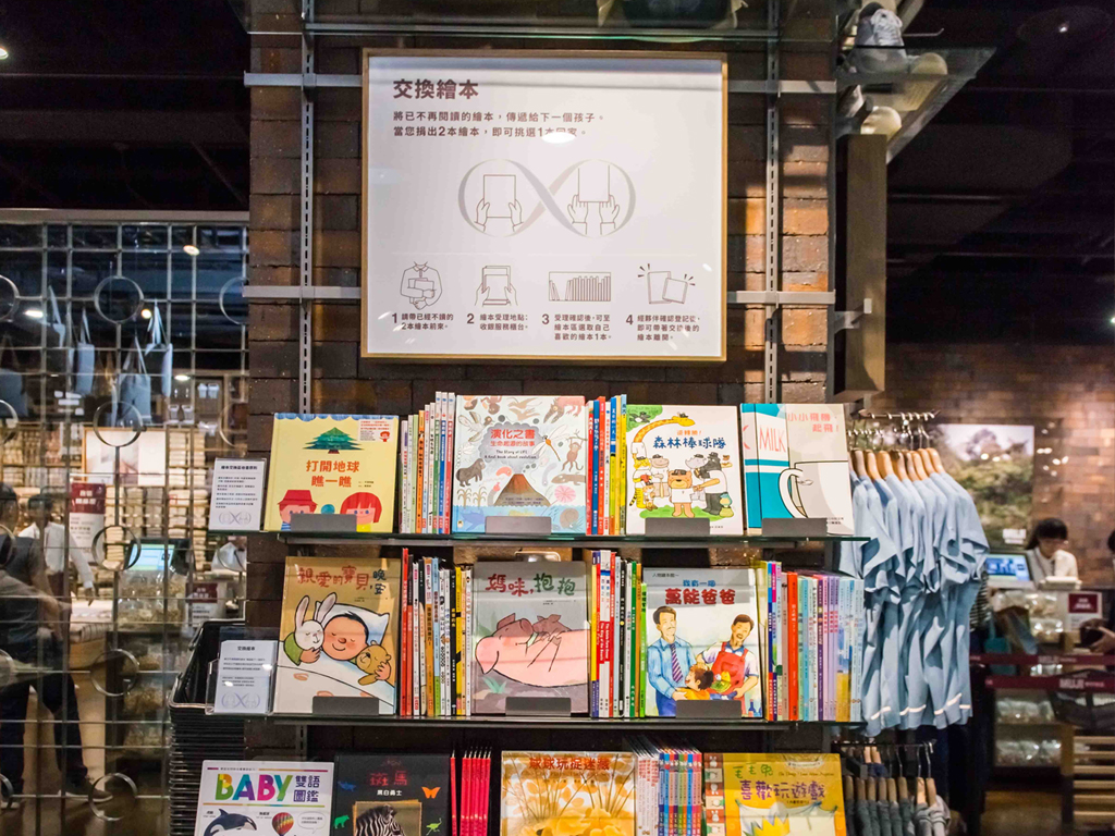 顧客可攜帶家中不再閱讀的繪本前往門市交換,每提供兩本即可換得一本,希望傳達分享的重要性,也有能延長書籍的使用生命,讓珍惜的善意與文字得以流傳。
