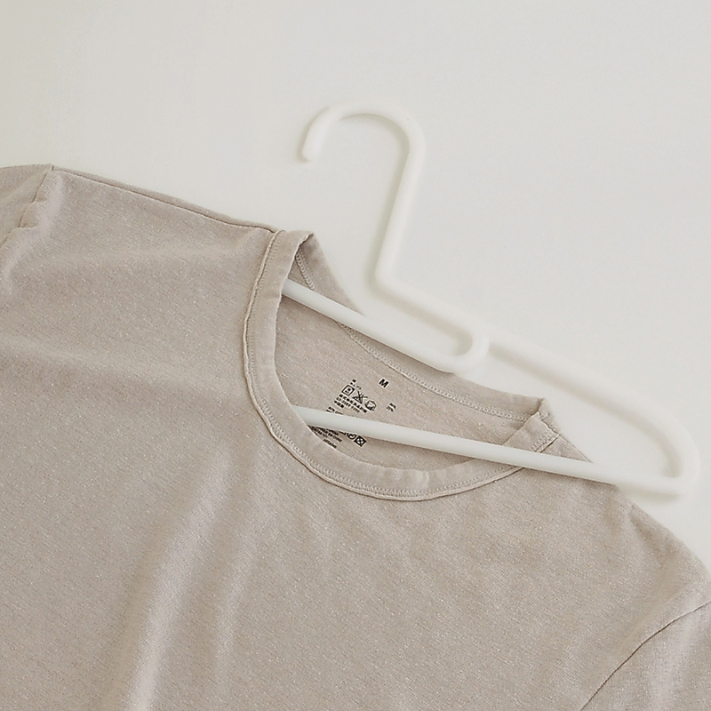 愛惜衣物避免染色的同時,也應留意領口不宜過度拉扯,造成變形。MUJI無印良品的PP衣架連掛衣服的角度都為顧客設想周到,採特殊造型設計,晾T恤及運動服時不易造成領口變形。