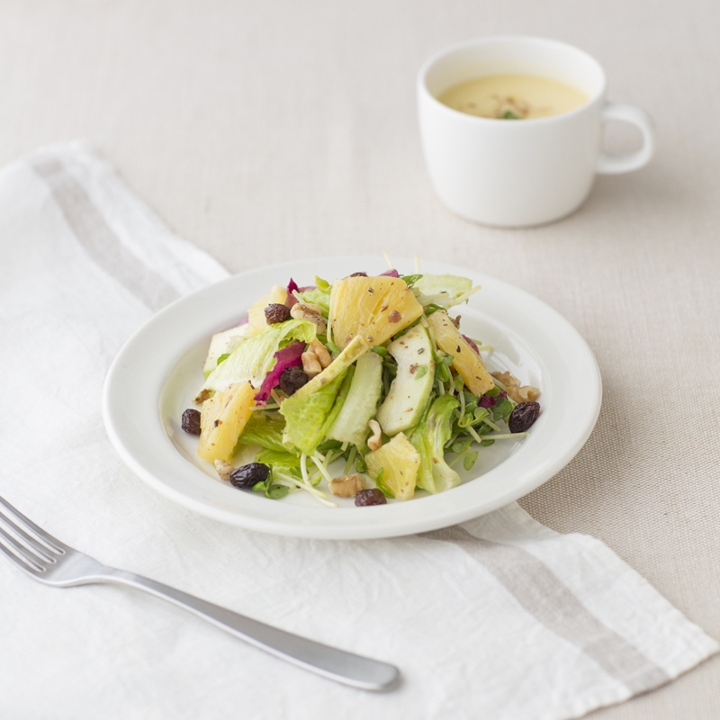 以夏多內白酒醋與葡萄乾打碎做成油醋醬汁,搭配多種春季盛產台灣水果及新鮮生菜。