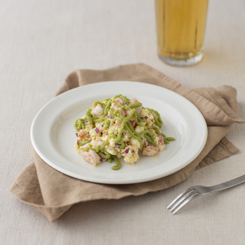 蝦仁以橄欖油及香草炒熟後,拌入自製的檸檬蛋黃醬,再加入小蕃茄、紫洋蔥與酪梨增添清爽感。