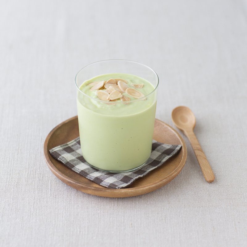 使用酪梨與台灣嚴選鮮乳,以蜂蜜增添甜味,再搭配烤杏仁片。