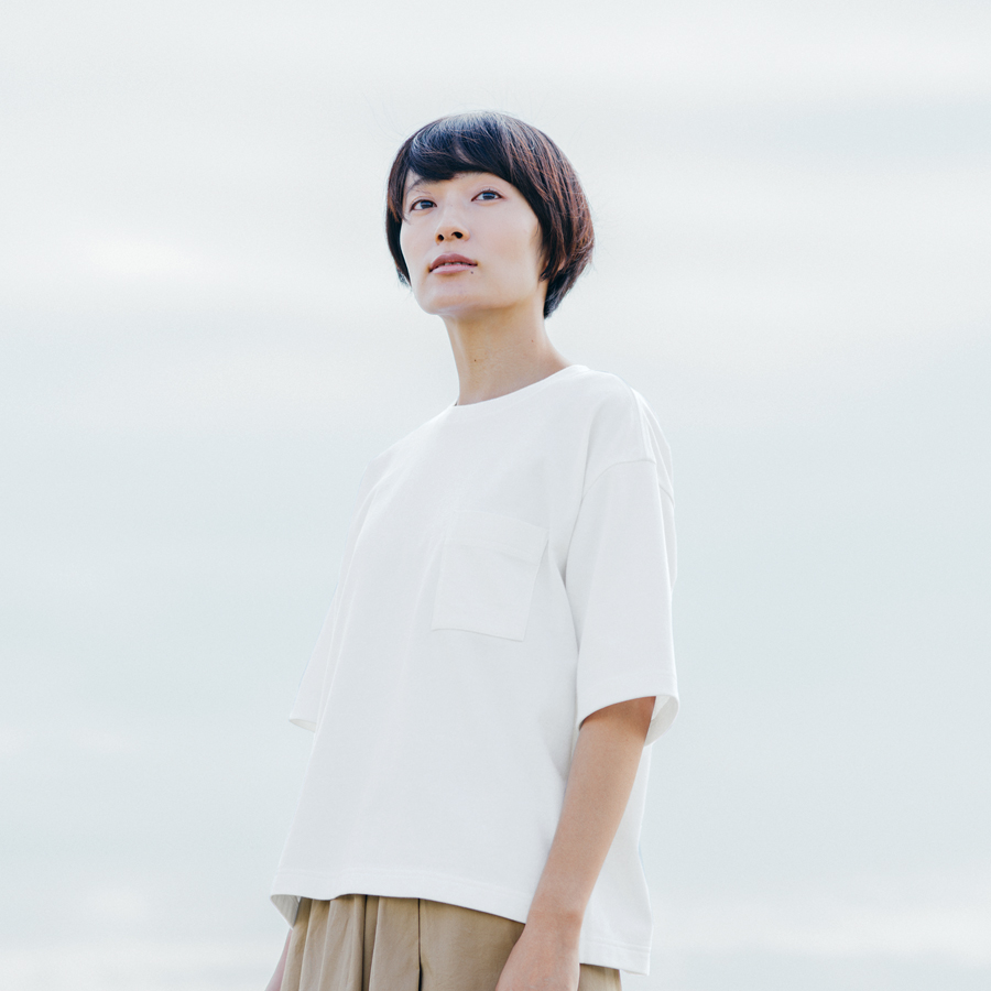 女有機棉粗織天竺圓領寬版五分袖T恤,450元:利用平滑織線所呈現硬挺的表面感為其特點。使用對環境溫和的有機棉所製成。