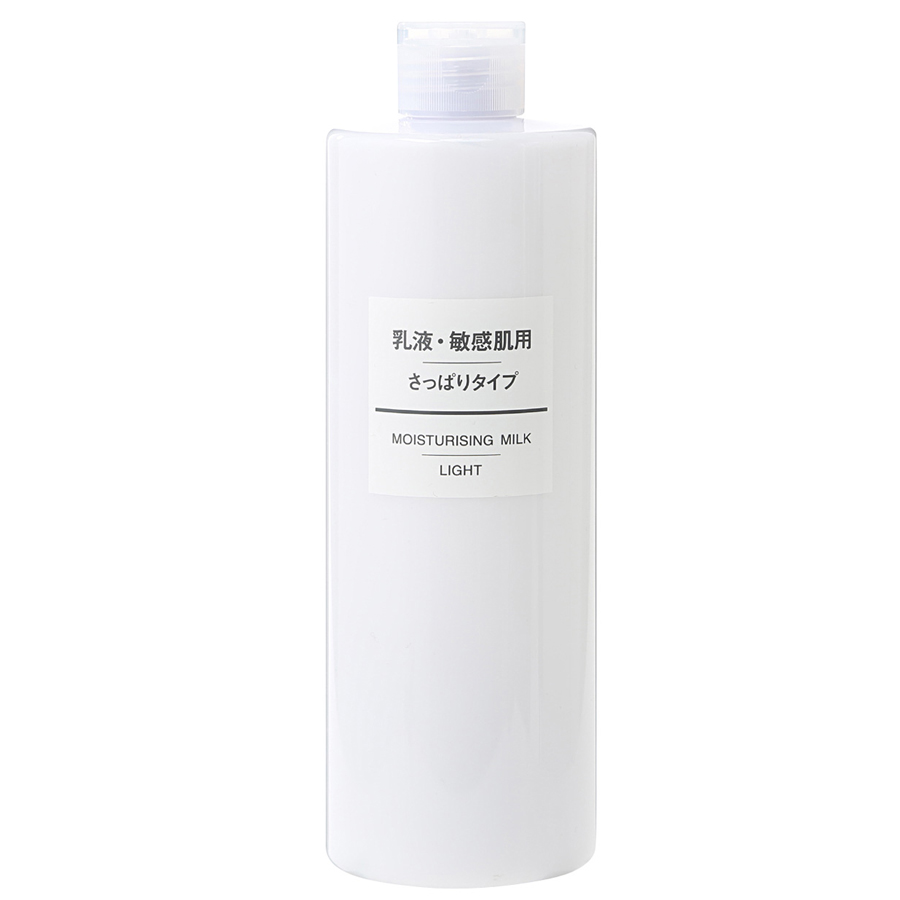 MUJI敏感肌乳液(清爽型) 400ml,380元: 取自日本岩手縣釜石天然水製成的肌膚保養系列。添加肌膚保護成分滑莧精華、葡萄柚籽精華,及保濕效果高的LIPIDURE(聚季銨鹽-51),低刺激性,提供乾燥敏感肌清爽潤澤。