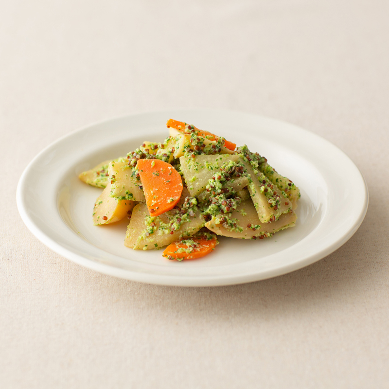 綠竹筍和豆薯以鹽麴及醬油調味後蒸烤,搭配VDS胡蘿蔔、台灣紅藜及菠菜毛豆醬,清爽又健康。