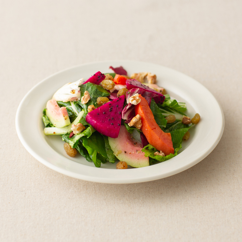 以夏多內白酒醋做成油醋醬汁,搭配紅心芭樂、高甜度的日昇木瓜、帶有花香的冠軍火龍果等秋季盛產台灣水果及新鮮生菜。