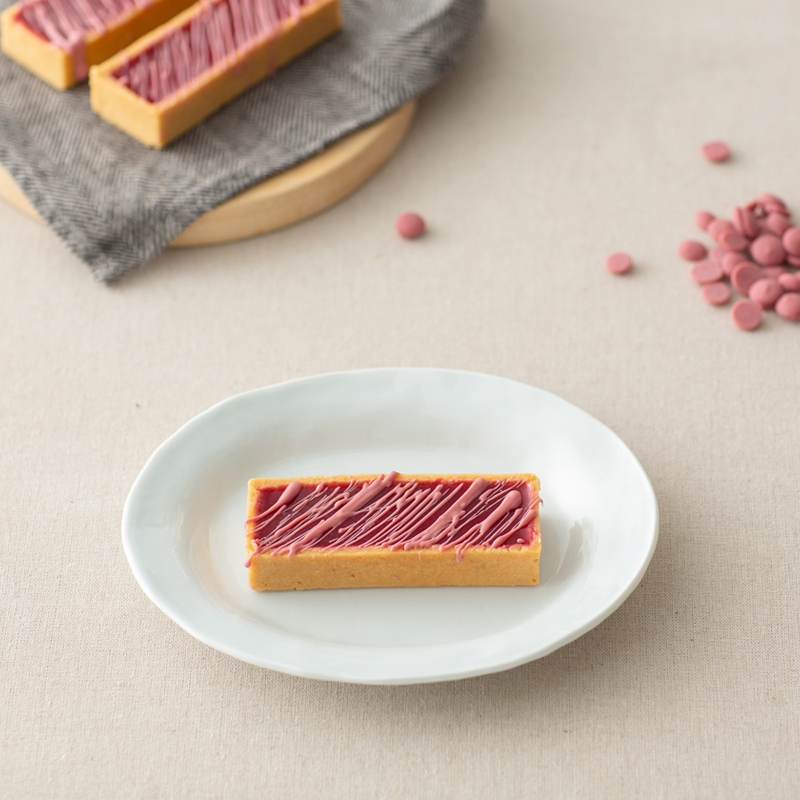 使用紅寶石巧克力製作成甘納許,再加入覆盆子酒增添風味。巧克力本身帶有莓果的香氣,搭配酸甜的覆盆子果凍。