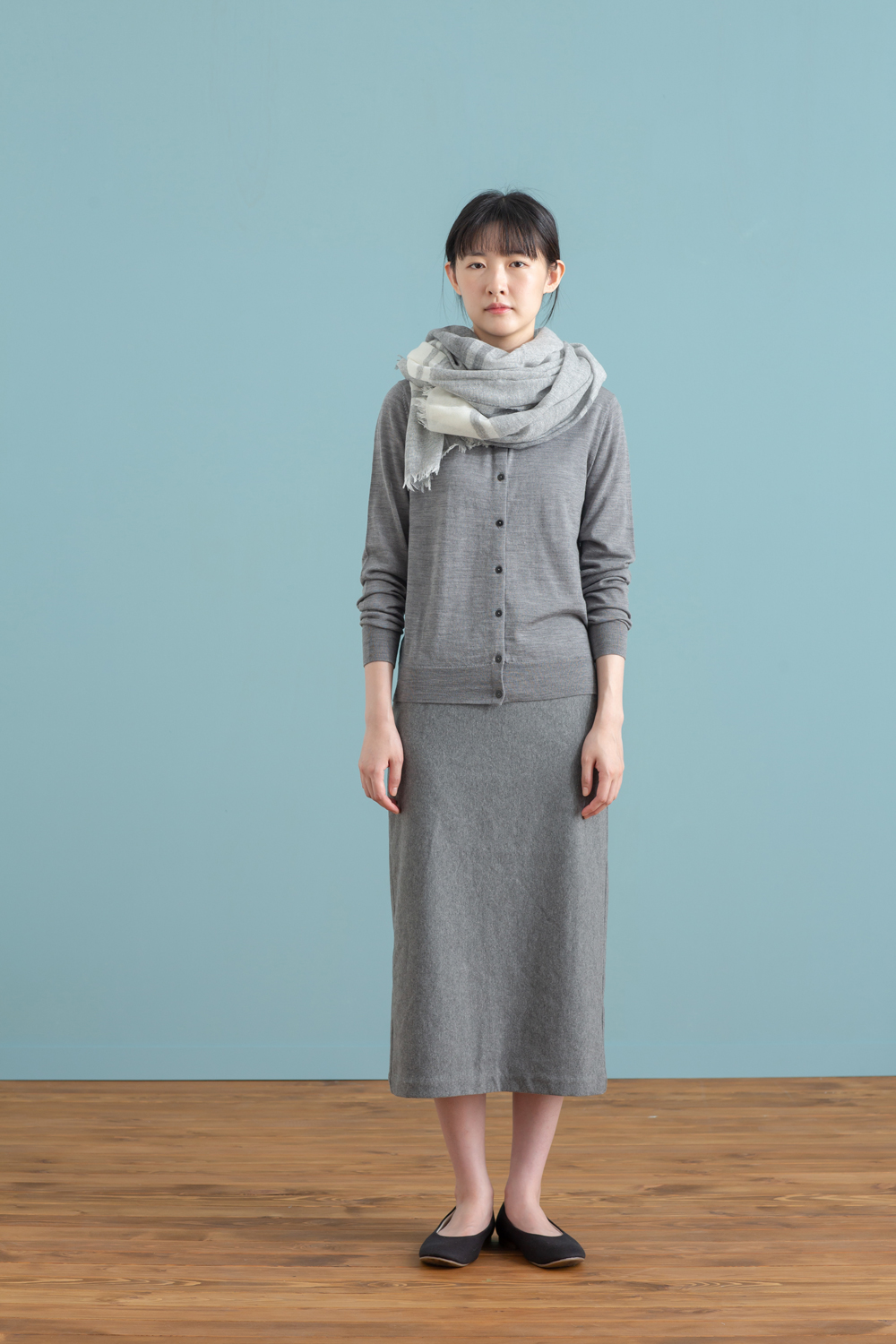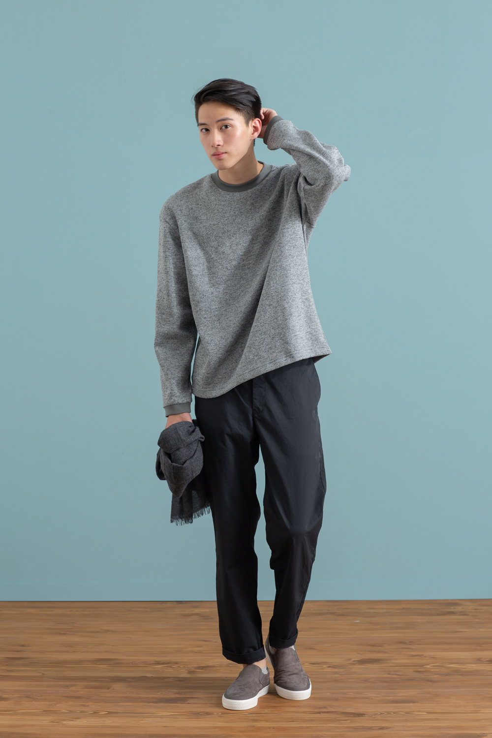 針對較喜歡黑、白搭配的顧客,「服飾造型顧問SA」建議可將白色服飾換為灰色調,在視覺上更能流露出秋冬溫暖與柔和的形象。像是女羊毛混蠶絲可水洗圓領開襟衫搭配女聚酯纖維混彈性起毛舒適裙及撥水加工起毛平底鞋,以點綴方式,帶出黑、灰兩款色調,令搭配上的質感與柔美兼具。男性顧客則推薦男聚酯纖維針織刷毛圓領衫與男聚酯纖維彈性綾織長褲、起毛加工聚酯纖維舒適基本便鞋,營造輕鬆舒適且富有色彩巧思的穿搭提案。