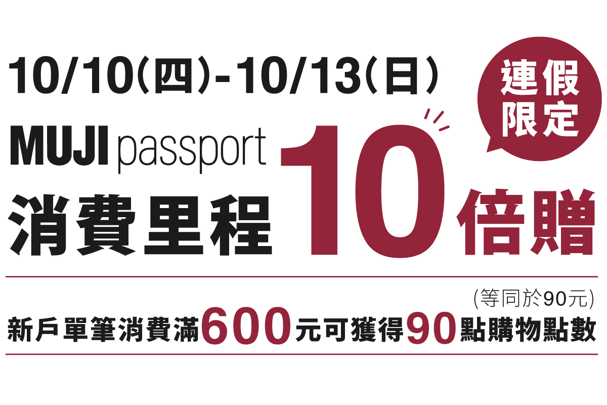 10/10-10/13雙十連假優惠,持MUJI passport消費即享里程10倍贈