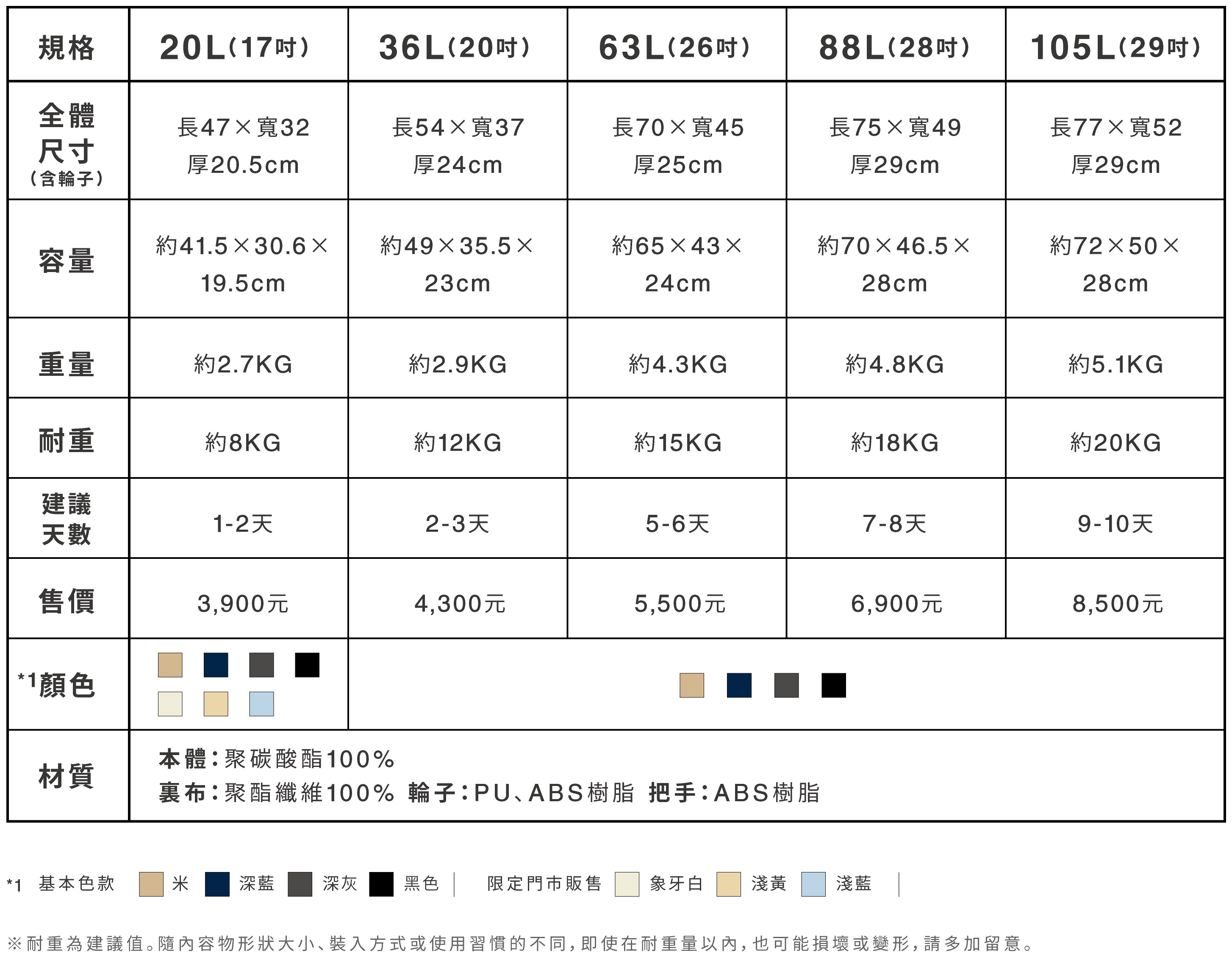 四輪硬殼止滑拉桿箱,3,900-8,500元:可自由調整高度的拉桿,採用雙輪式實心構造的輪子,按壓式的止滑開關,以及五種可選擇的尺寸,讓旅行前的準備以及旅途中更加輕鬆自在。
