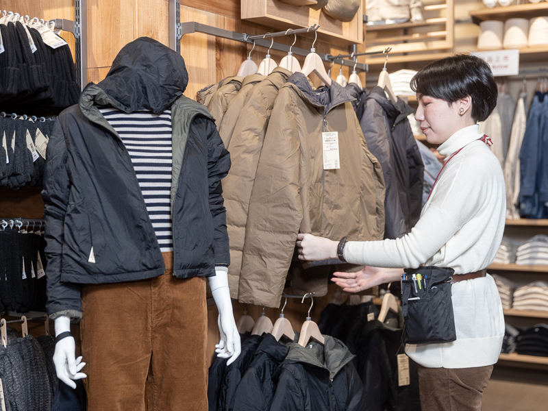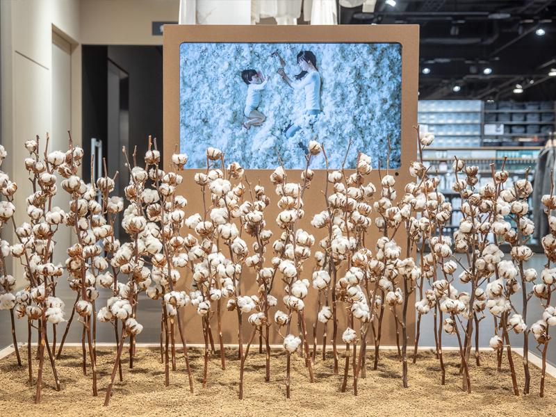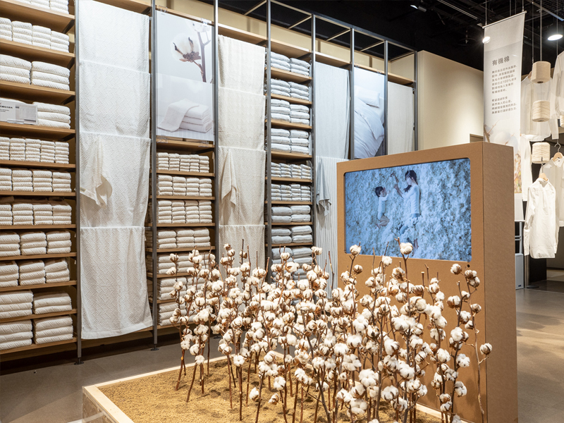 在門市裝潢上,松山車站門市佔地220坪,除了使用珍惜資源、強調取材自然的古材、鐵板與土牆外,MUJI無印良品特別在門市入口處設置一處展區,向顧客傳遞品牌選擇「有機棉」素材的理念:「有機棉」種植於三年以上未施用農藥與化肥的土地,製作出的服飾與織品希望傳達友善使用者、土地環境及生產者的善意。