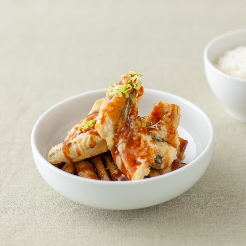 使用挪威鯖魚,酥炸後淋上日式風味的薑汁味噌醬,再搭配炸牛蒡。