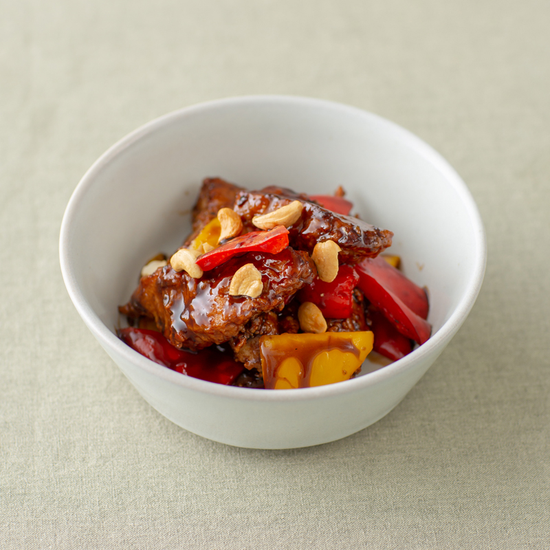 香草豬油炸後與使用巴薩米克醋和本和香糖熬煮的糖醋醬汁拌炒。