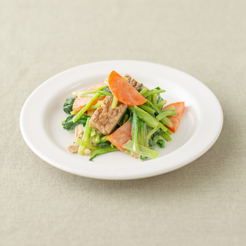 油豆腐與小松菜等蔬菜搭配日式風味的胡麻味噌醬。