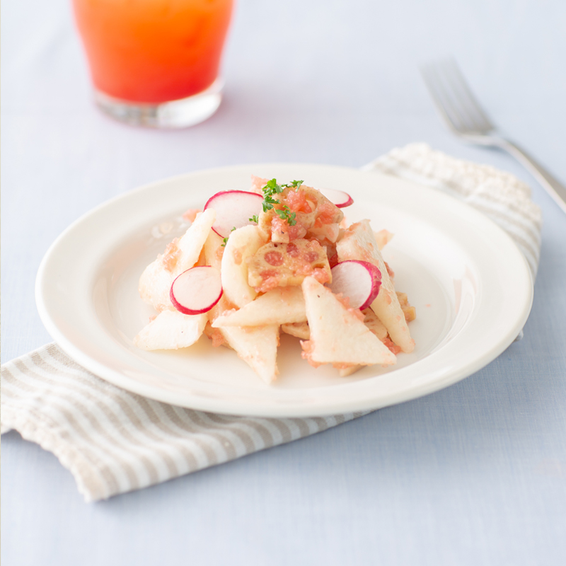 將櫻桃蘿蔔製成寒天果凍,與爽脆根菜一同享用。