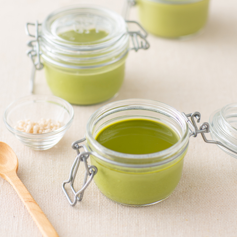 選用日本宇治抹茶製成的布丁,搭配台灣紅藜麥米香。