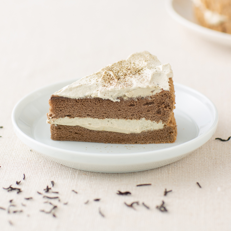 戚風蛋糕體中加入焙茶粉,再夾入焙茶風味的鮮奶油享用。