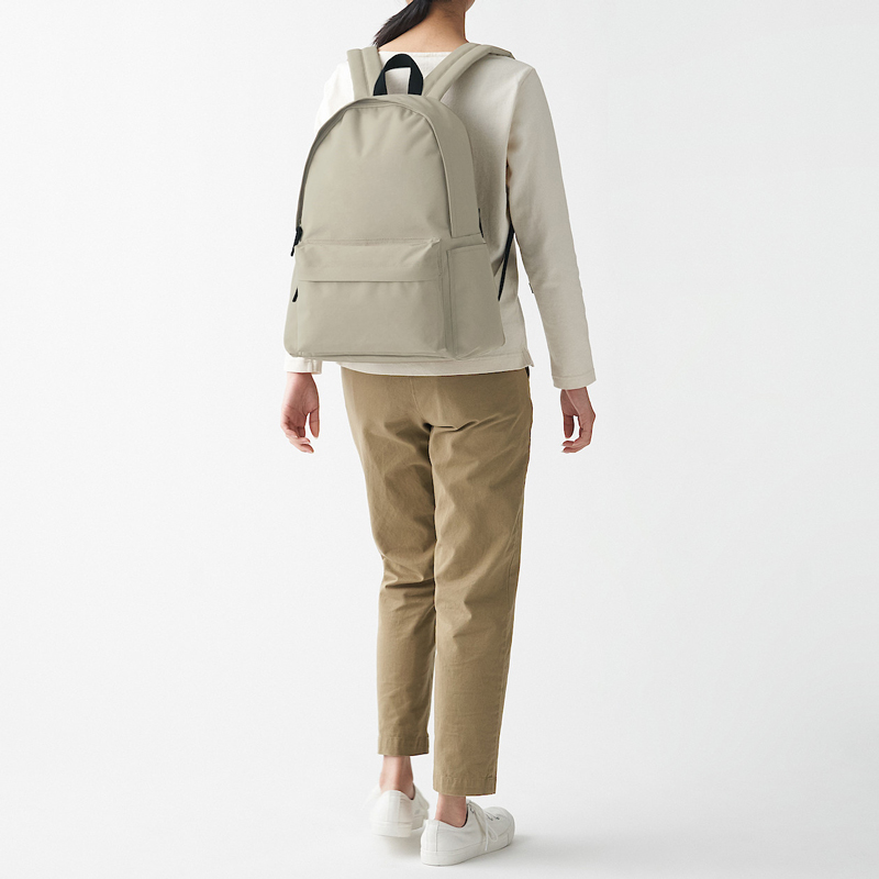 可減輕肩膀負擔撥水加工聚酯纖維後背包,990元:使用可減輕肩膀負擔的肩背軟墊。附有可收納筆電的內袋。可加掛固定於拉桿箱設計。
